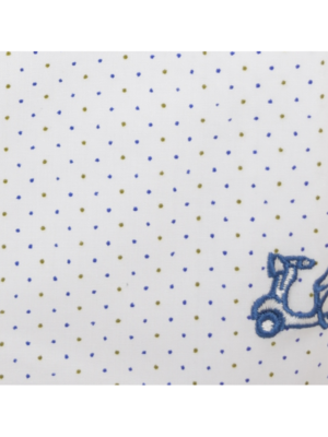 Camisa de niño con estampado de topitos rojo y azul. Fondo celeste. Compuesta de 65 % algodón. Manga larga. Cuello con botón.