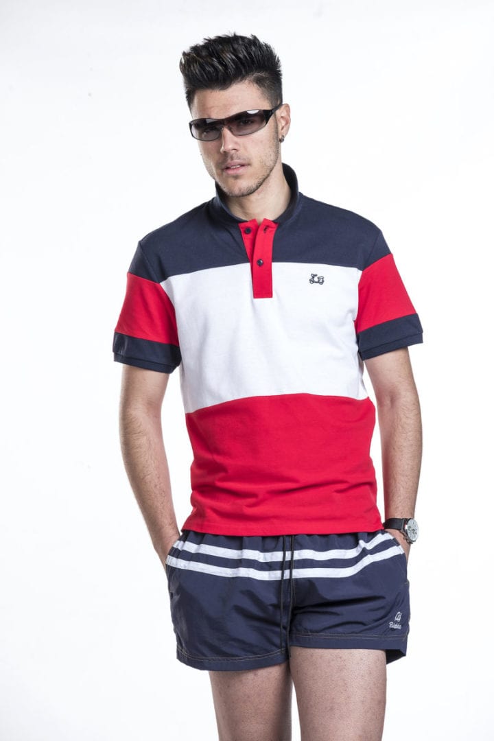 Bañador con rayas blancas en horizontal. Cintura elástica ajustable con cordón. Bolsillo trasero. Forro interior. 100% Poliéster.