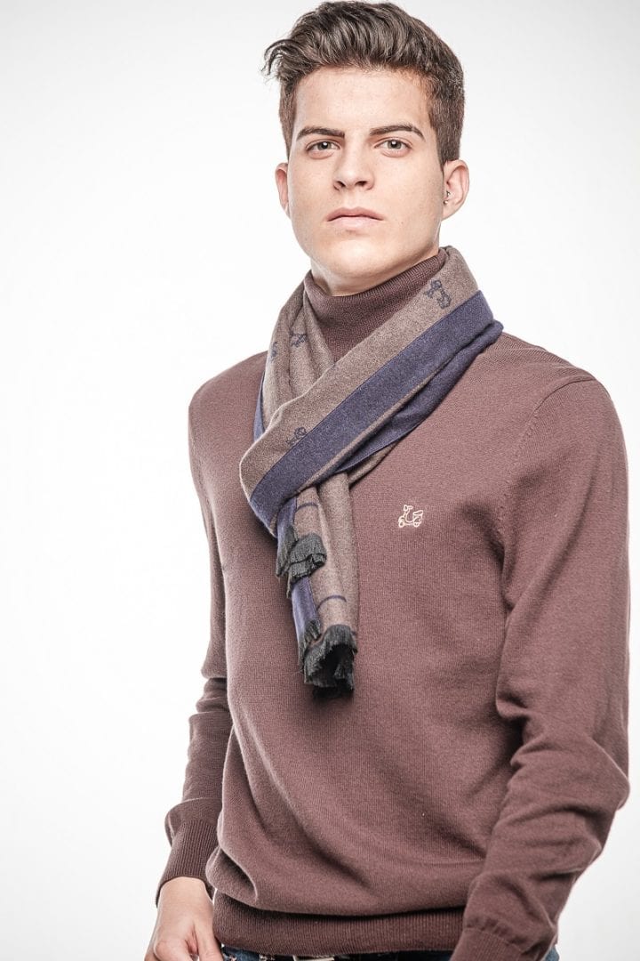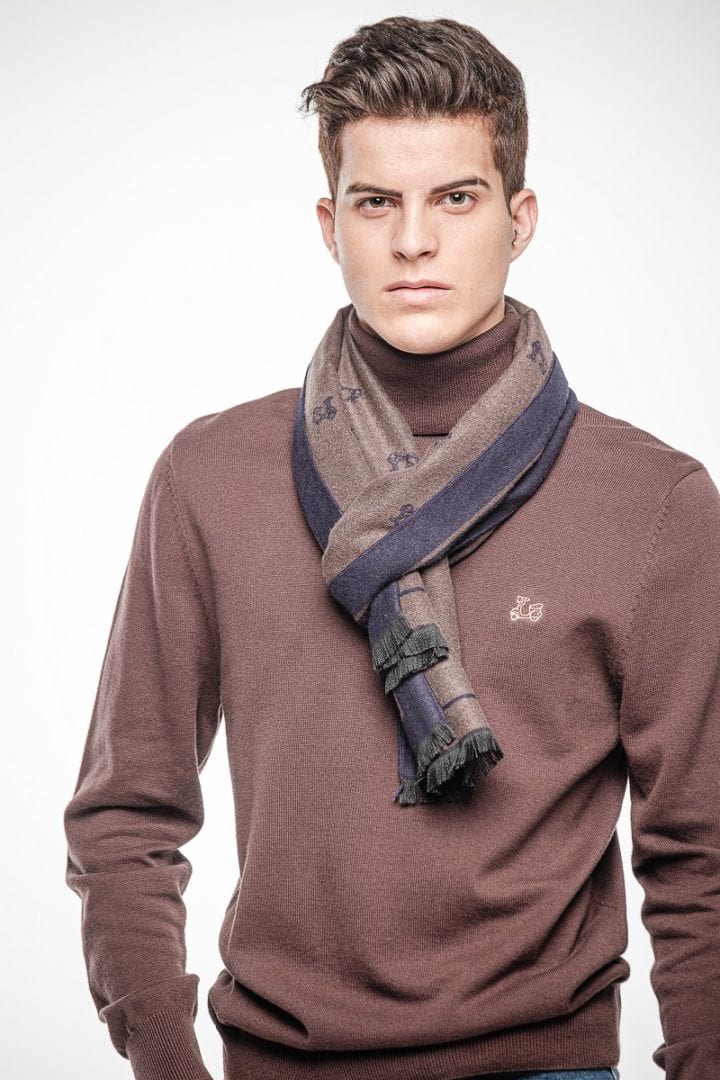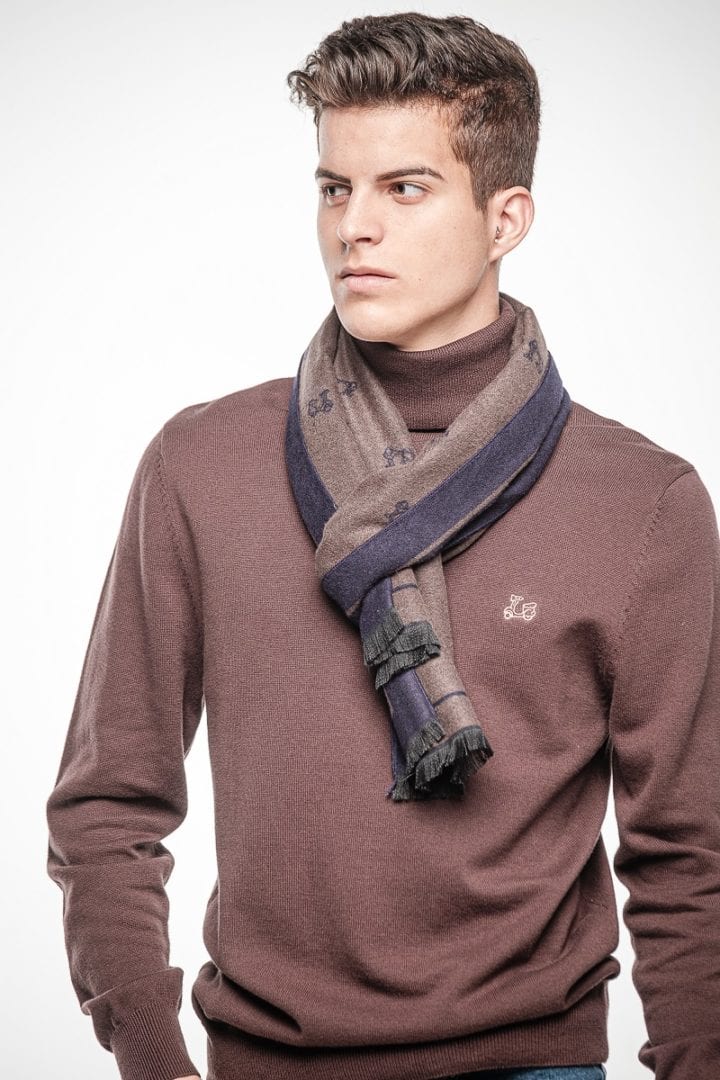 Bufanda reversible bicolor (marino y verde oscuro) con motos Ridebike. Terminaciones deshilachadas. Compuesta de 65% Viscosa y 35% Poliéster