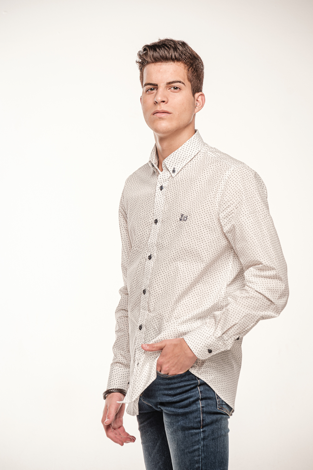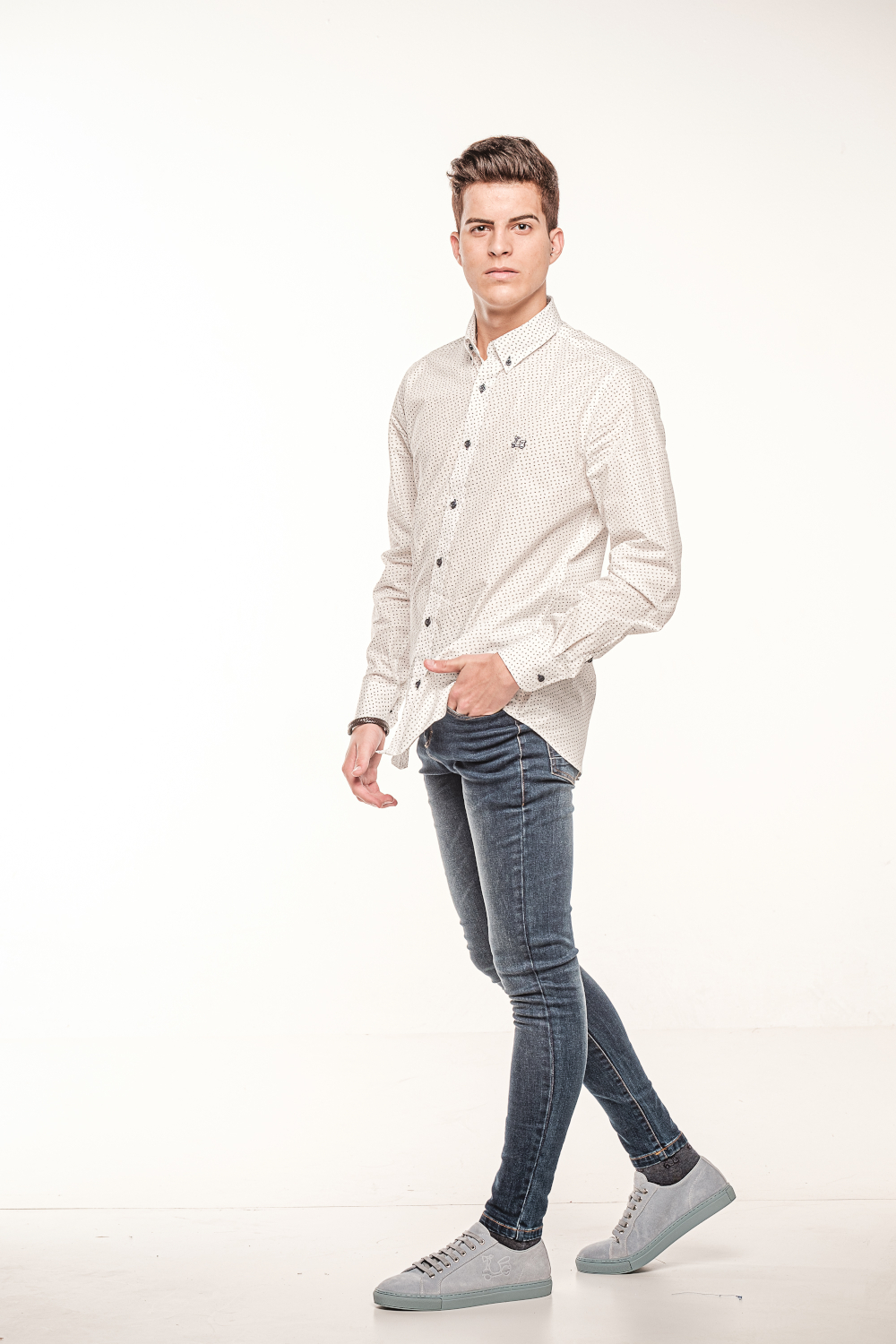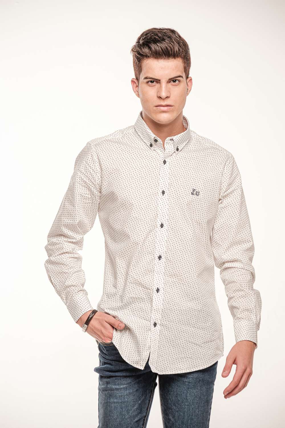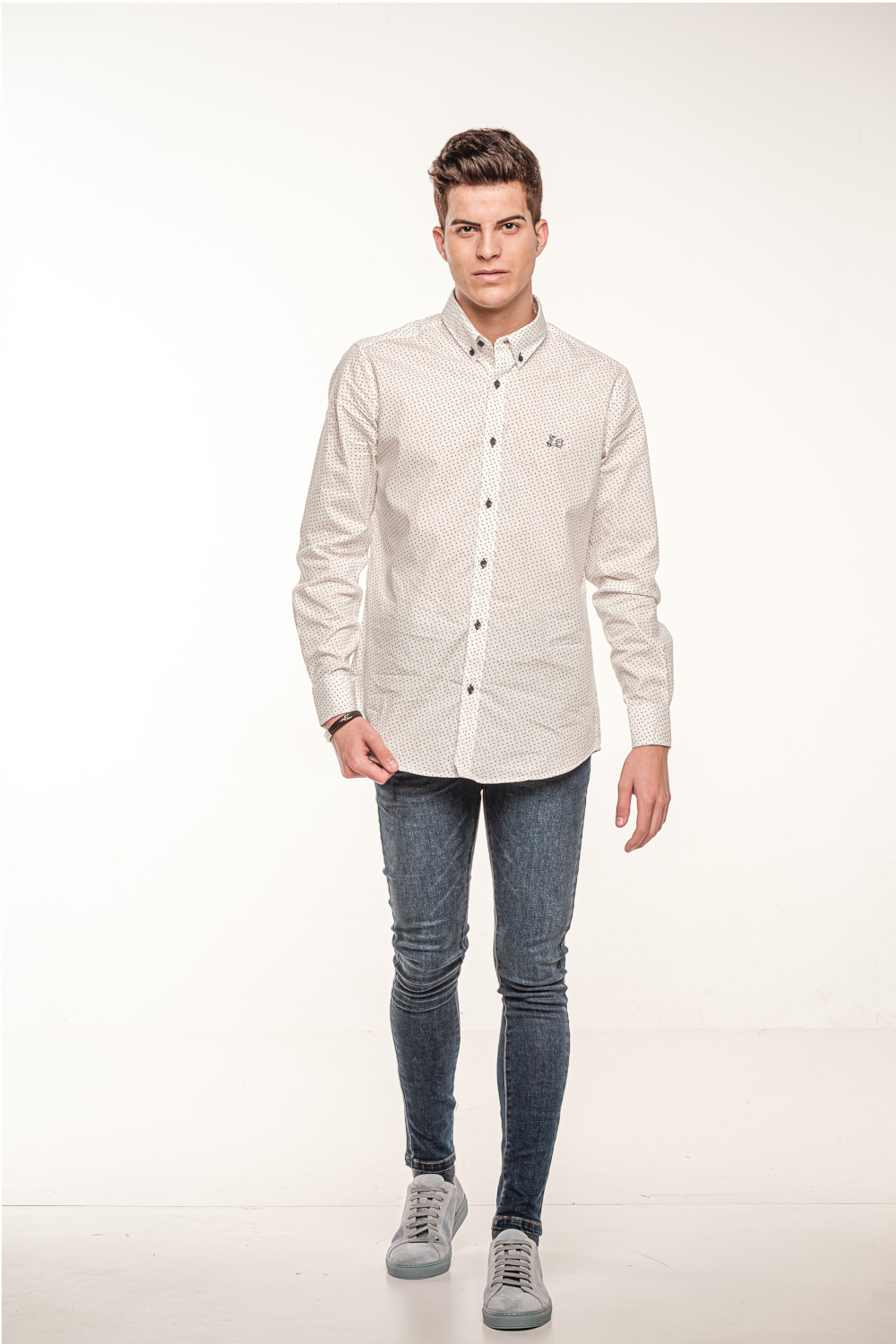 Camisa con estampados de hojas. Fondo blanco. Compuesta de 100% algodón. Manga larga. Corte semientallado. Cuello con botón y el puño con cierre de dos botones.