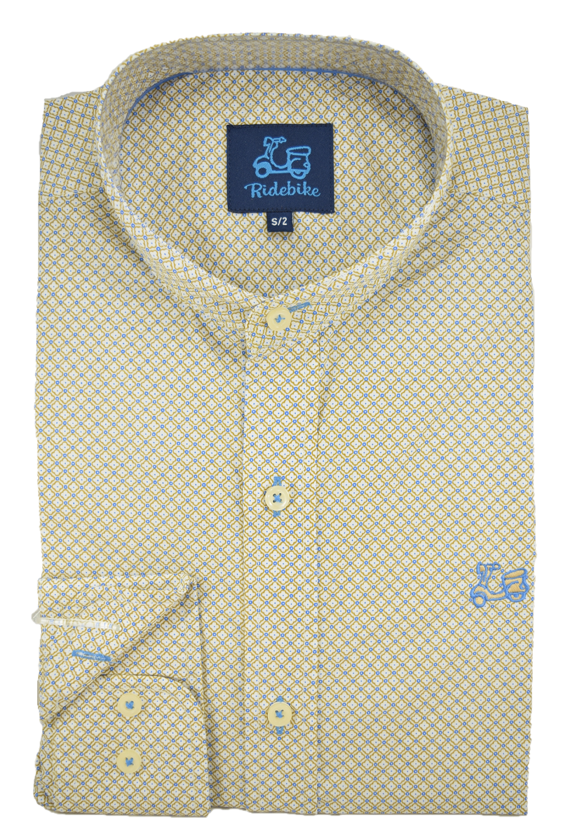 Camisa beige con estampado de diseño. Corte semientallado. Manga larga. Logotipo de vespita bordado en pecho. Cuello mao y el puño con cierre de dos botones.