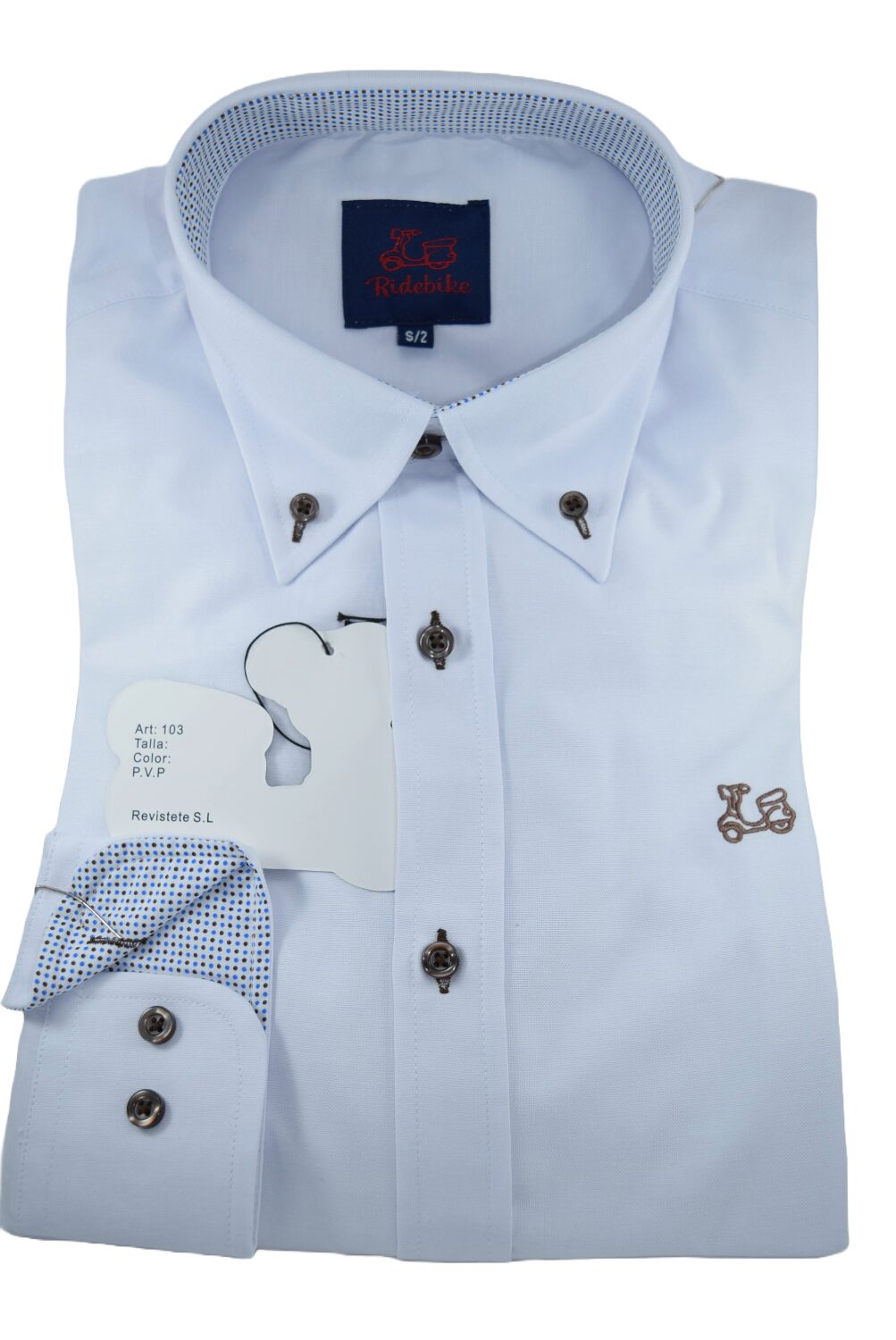 Camisa blanca. Manga Larga. Compuesta de 100% algodón y corte semientallado. Cuello con botón.