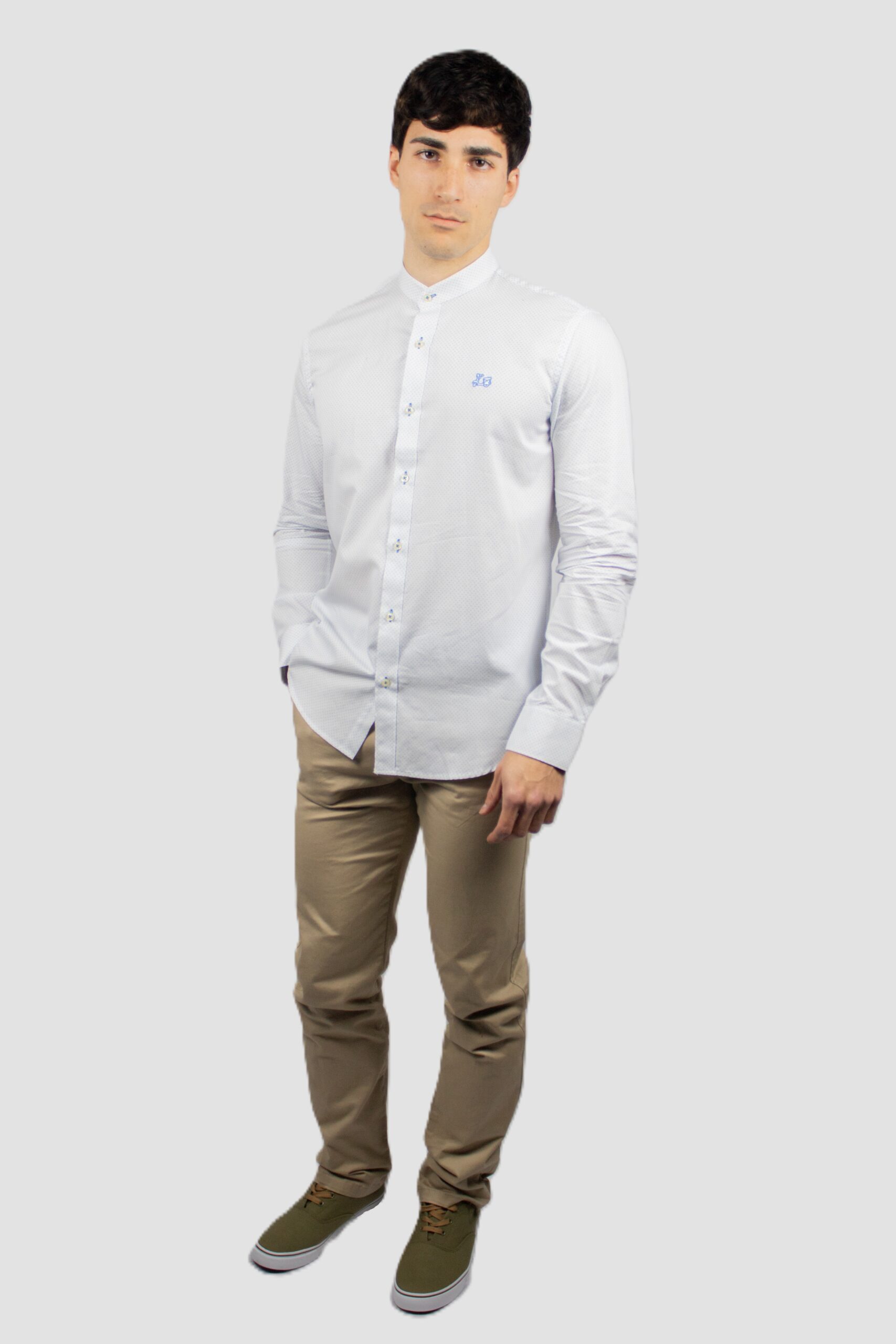 Camisa blanca con patrón de flores estampado confeccionada en 100% algodón de corte Regular fit. Presenta cuello mao. Manga larga con puño de cierre con botones. Bordado del logotipo Ridebike en pecho.