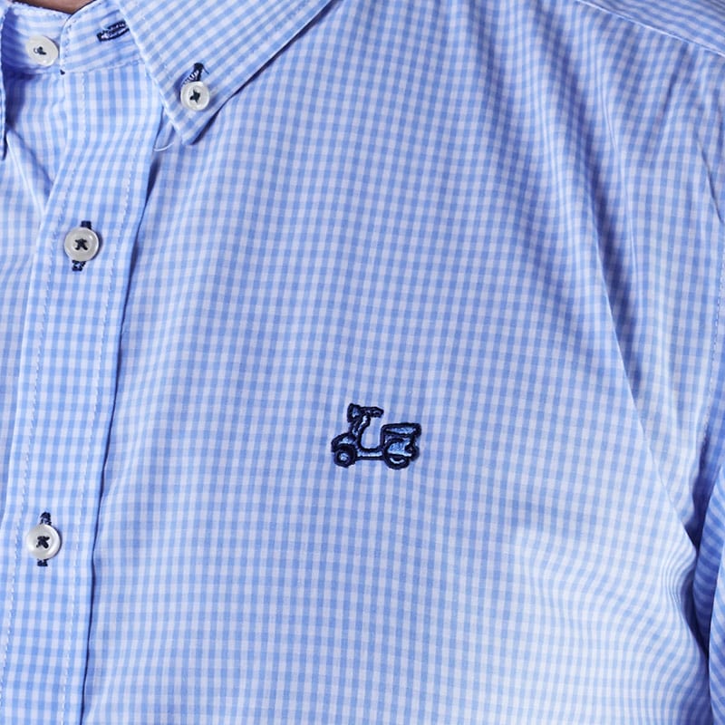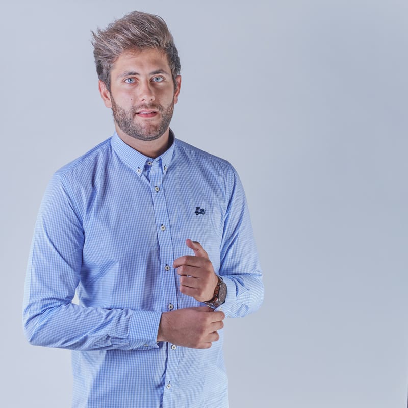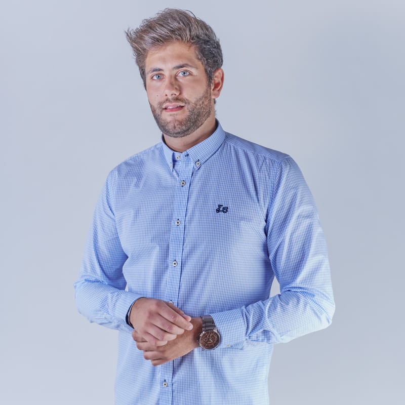 Camisa de cuadros Vichy celeste. Manga larga. Compuesta de 65% algodón y corte semientallado. Cuello con botones.