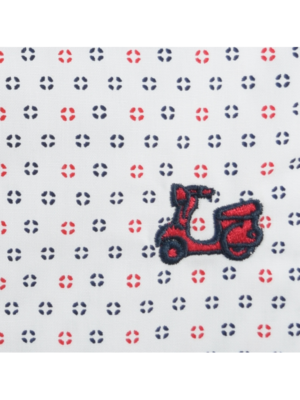 Camisa de niño de topitos azules estampados. Compuesta de 65 % algodón. Manga larga. Cuello con botón.