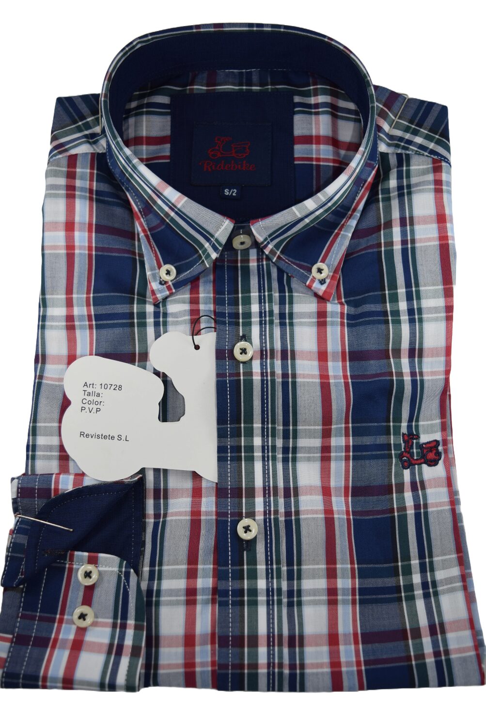 Camisa cuadros marino y rojo. Manga Larga. Compuesta de 65% algodón y corte semientallado. Cuello con botón.