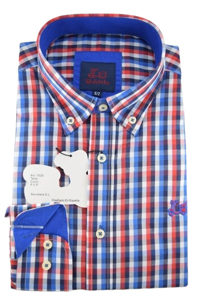 Camisa de cuadros rojos y azules. Combinación azul eléctrico en interior de puño y cuello. Corte semientallado. Manga larga. Logotipo de vespita bordado en pecho. Cuello con botón y el puño con cierre de dos botones.