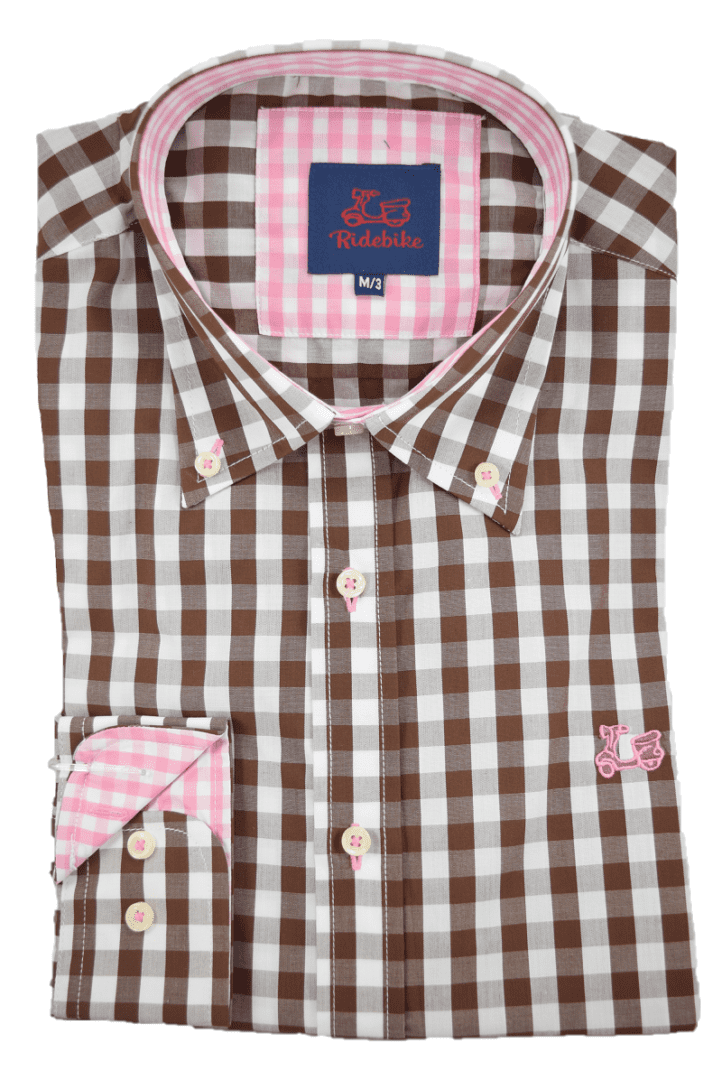 Camisa de cuadros marrones. Combinación cuadros rosas en interior de puño y cuello. Corte semientallado. Manga larga. Logotipo de vespita bordado en pecho. Cuello con botón y el puño con cierre de dos botones.