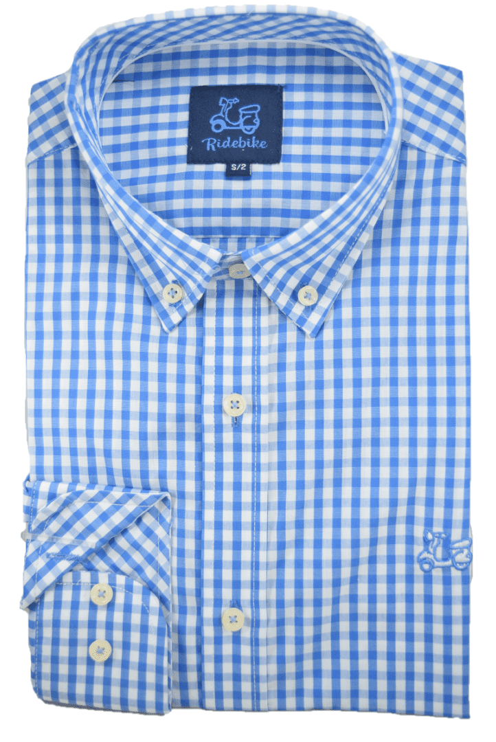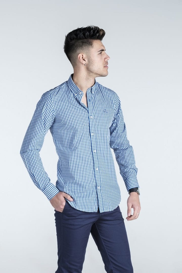 Camisa de cuadros. Compuesta de 65% algodón. Manga larga. Corte semientallado. Cuello con botón.