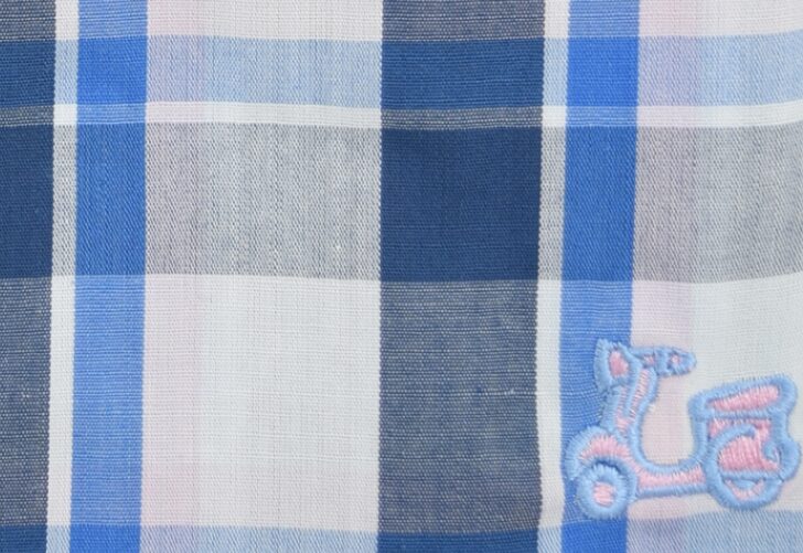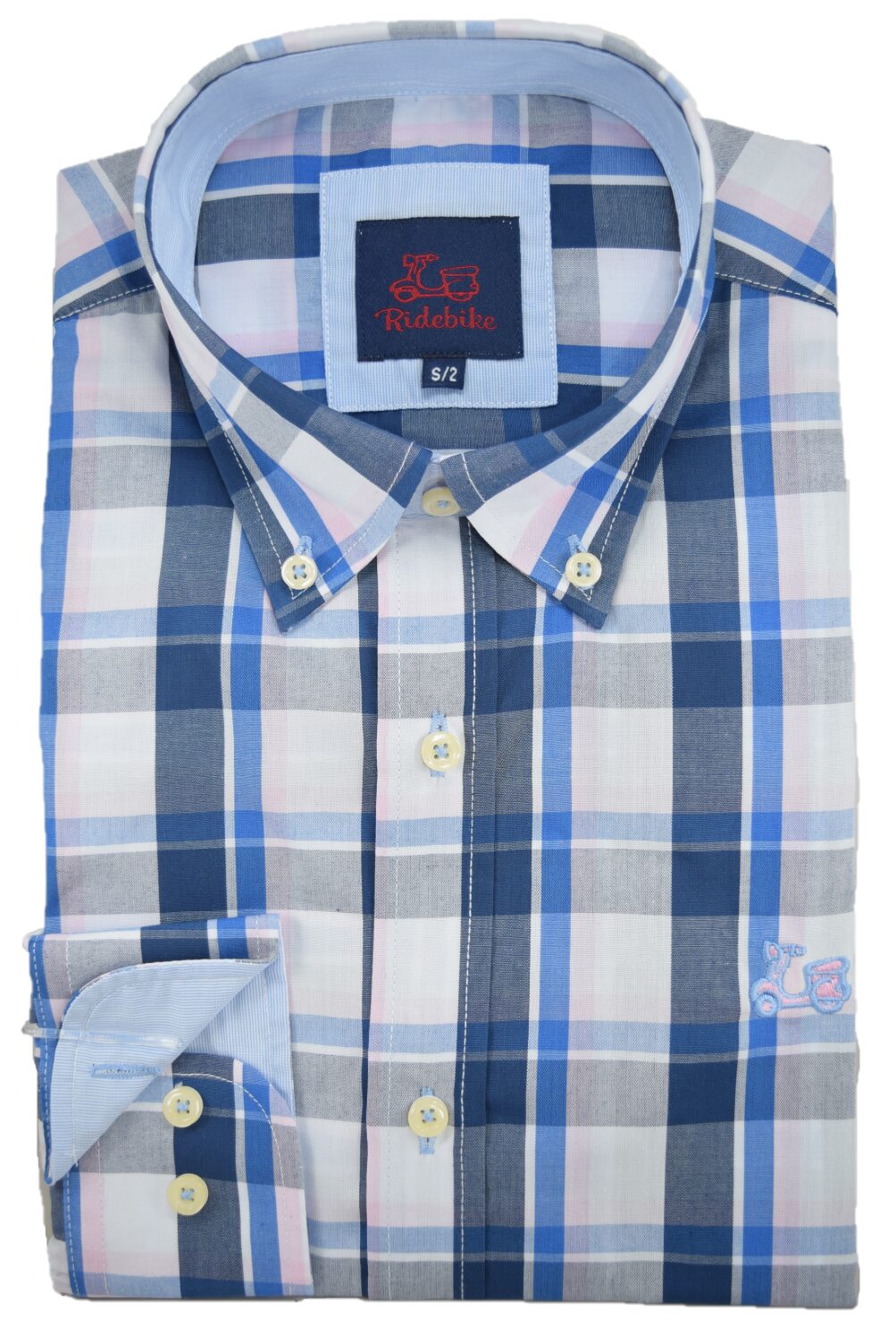 Camisa de cuadros azul. Compuesta de 65% algodón. Manga larga. Corte semientallado. Cuello con botón.