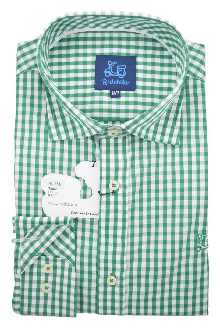 Camisa de cuadros verde. Compuesta de 65% algodón. Manga larga. Corte semientallado. Cuello italiano.