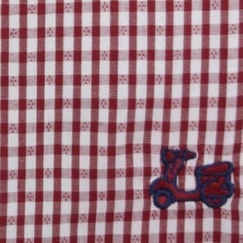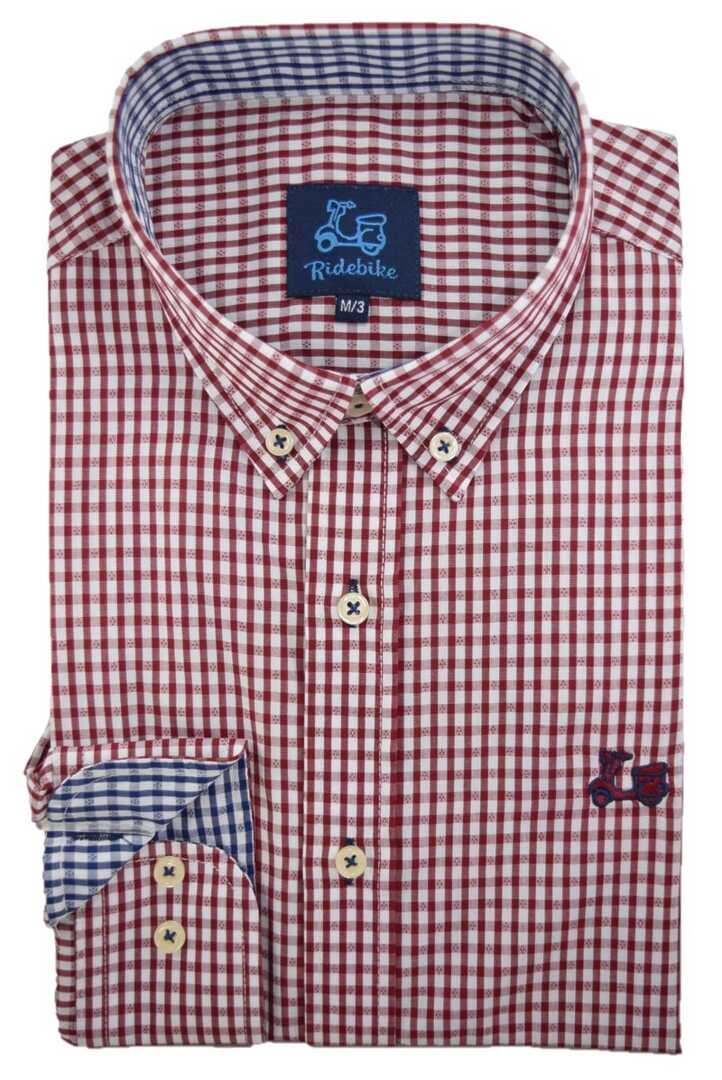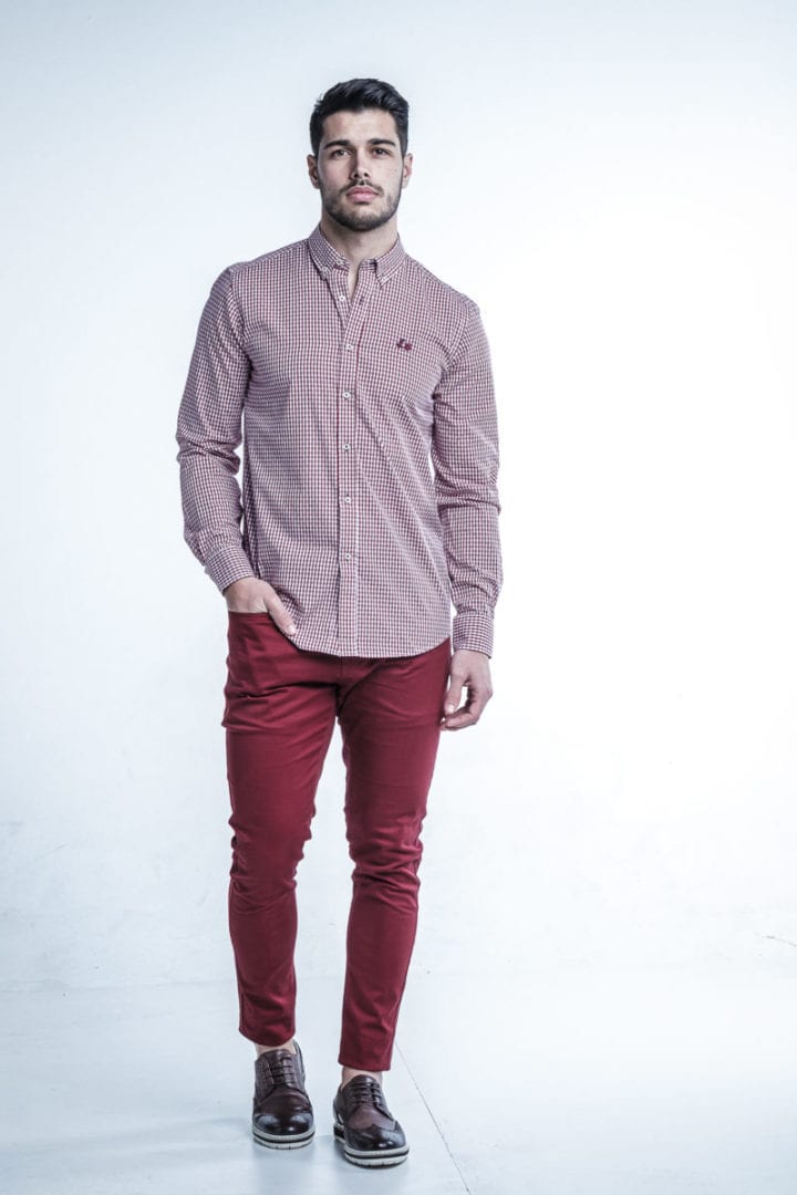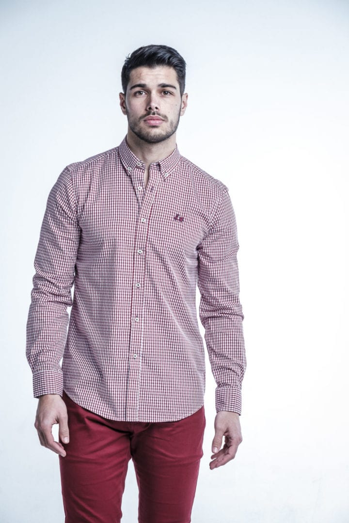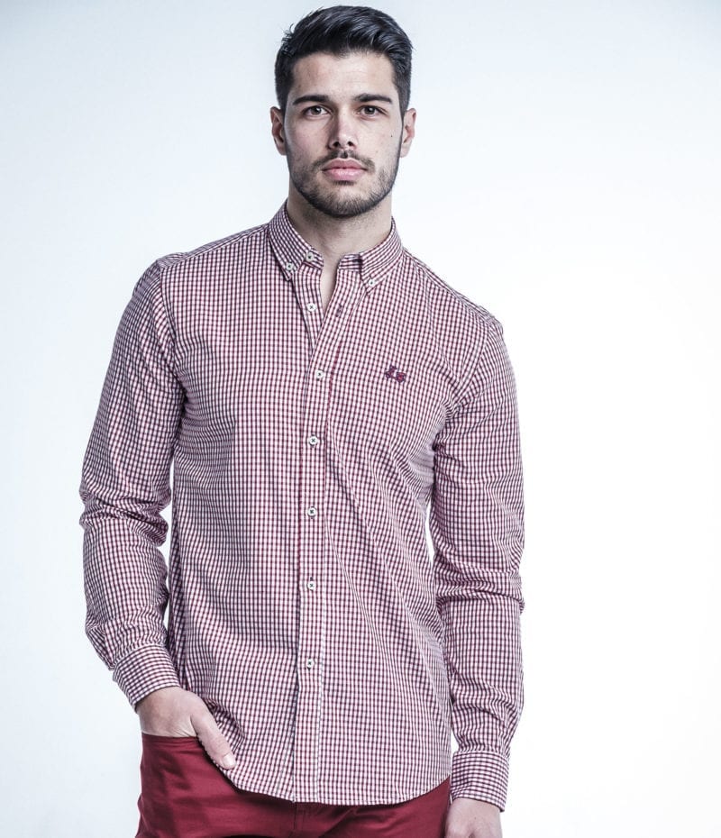 Camisa de cuadros rojo. Compuesta de 65% algodón. Manga larga y corte semientallado. Cuello con botón.