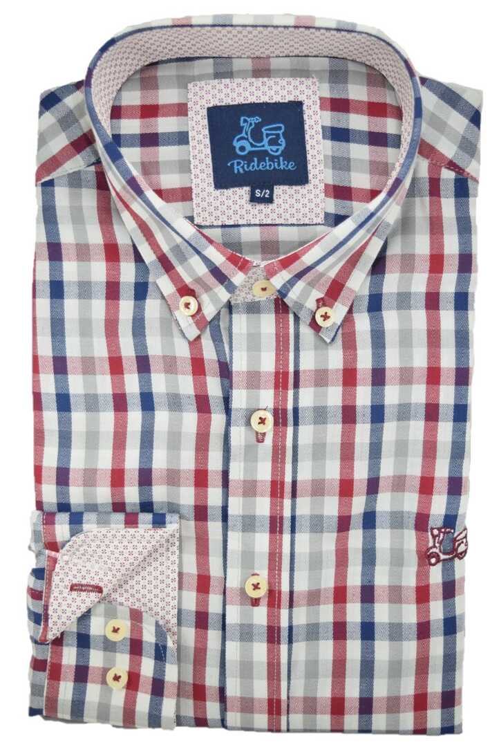 Presenta diseño de cuello button-down, manga larga con puño abotonado y cierre frontal con botones personalizados. Cuenta con un bordado de moto Ridebike en pecho.