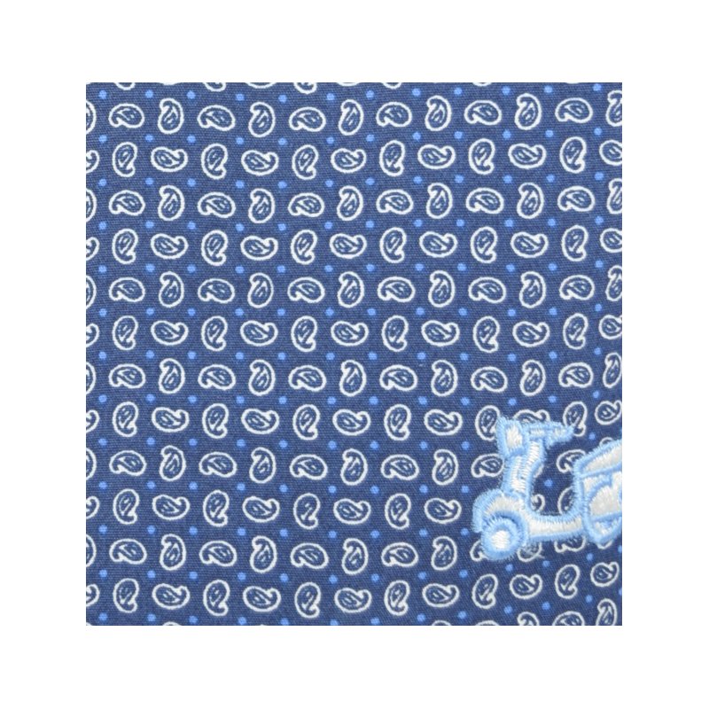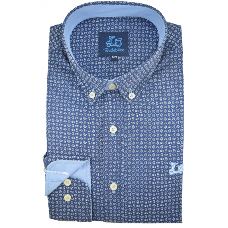Camisa de estampado cachemir. Fondo azul. Compuesta de 65% algodón. Corte semientallado. Manga larga. Cuello con botón y el puño con cierre de dos botones.