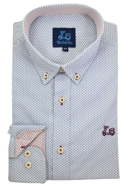 Camisa de estampado celeste y micropuntos. Fondo blanco. Compuesta de 65% algodón. Corte semientallado. Manga larga. Cuello con botón y el puño con cierre de dos botones.