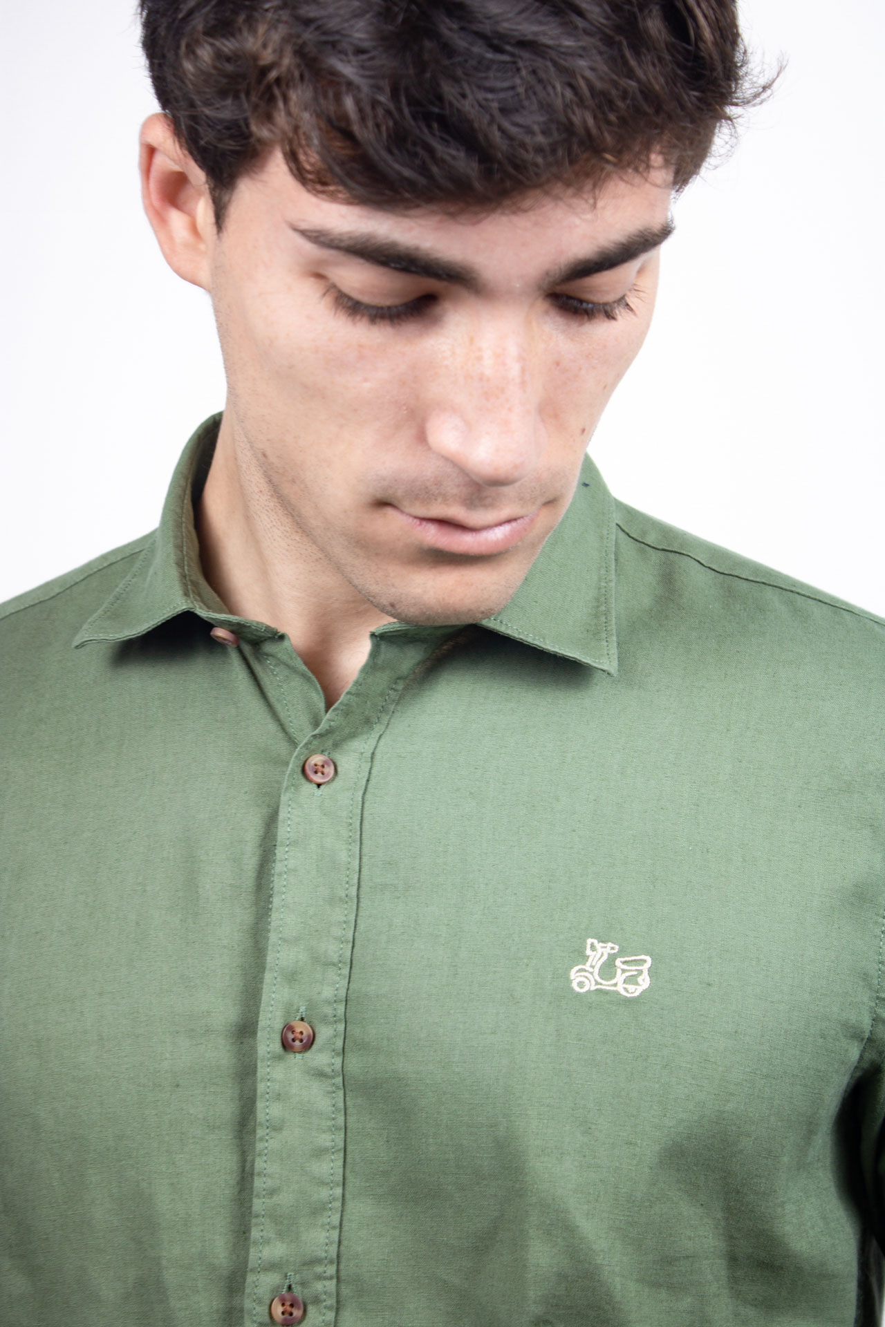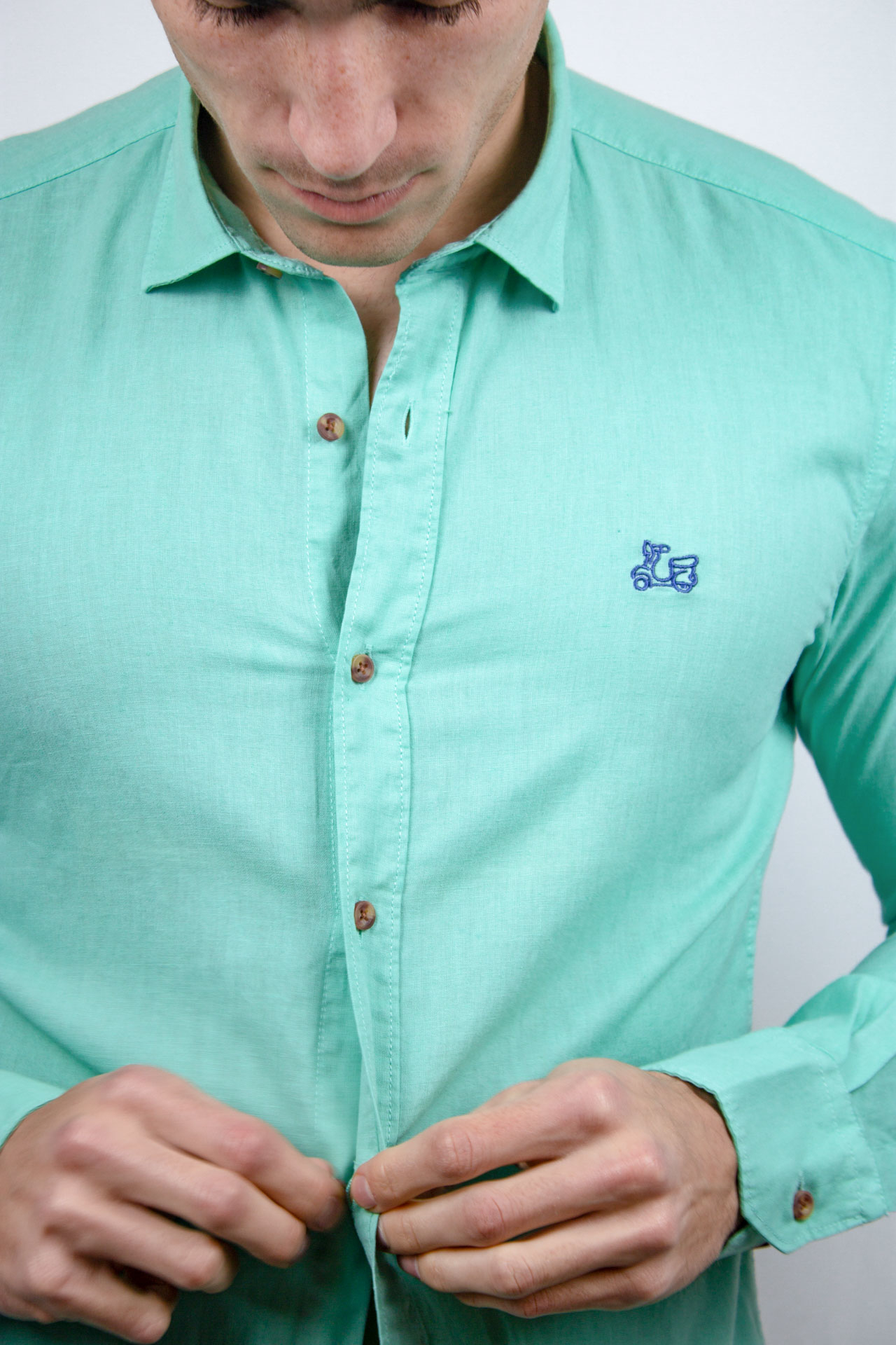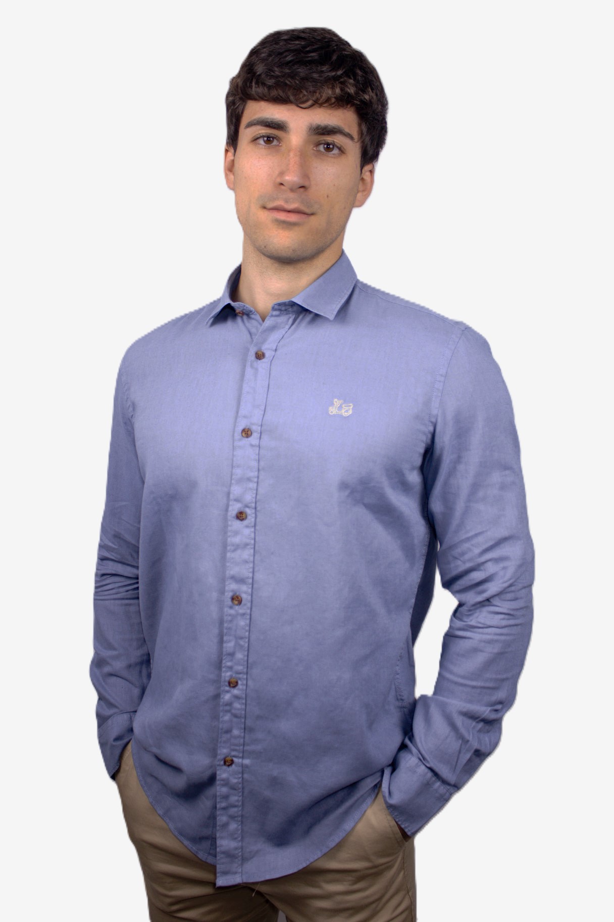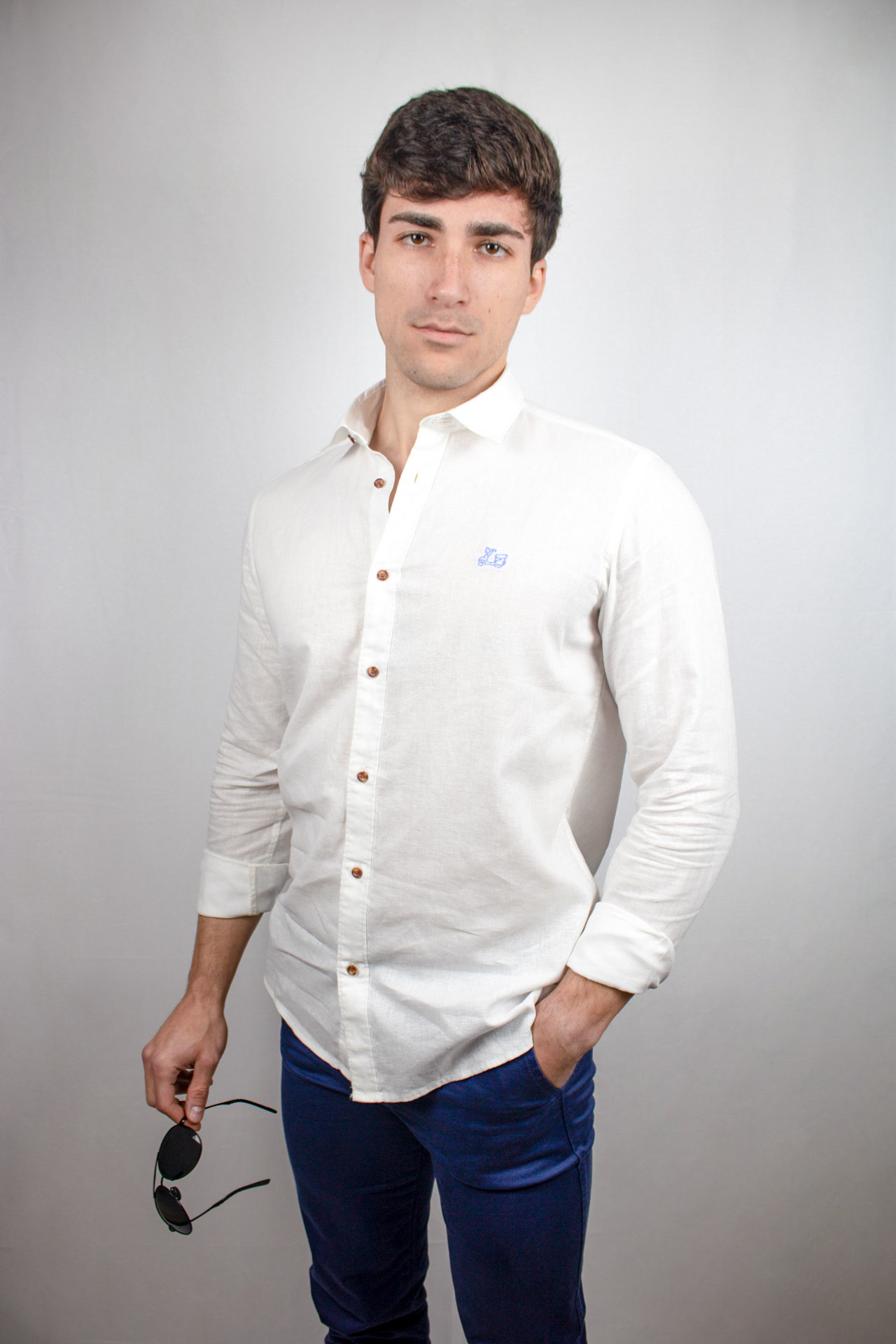 Camisa de lino clásica. Compuesta de mezcla de algodón y lino de corte Regular fit. Presenta diseño de cuello italiano, manga larga con puño abotonado y cierre frontal con botones personalizados. Cuenta con un bordado de moto Ridebike en pecho.