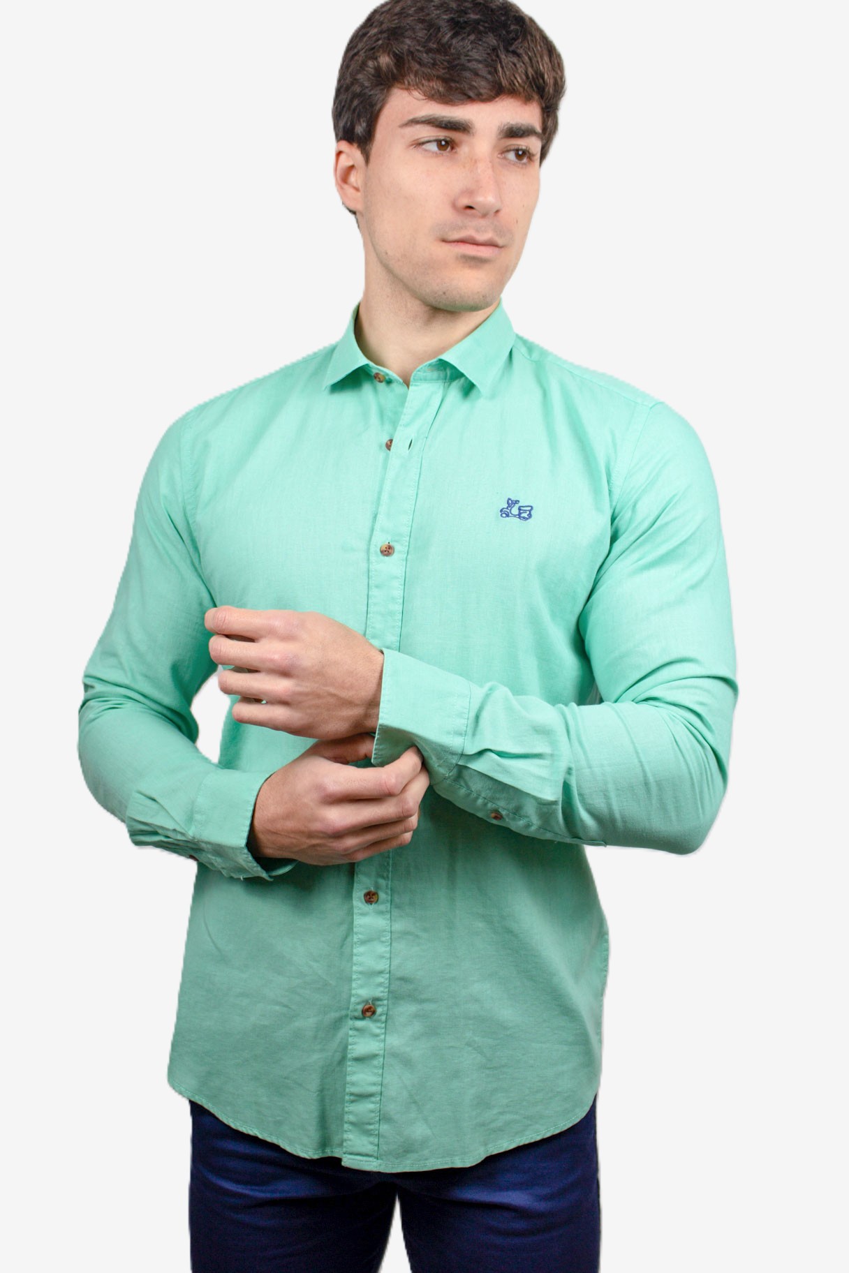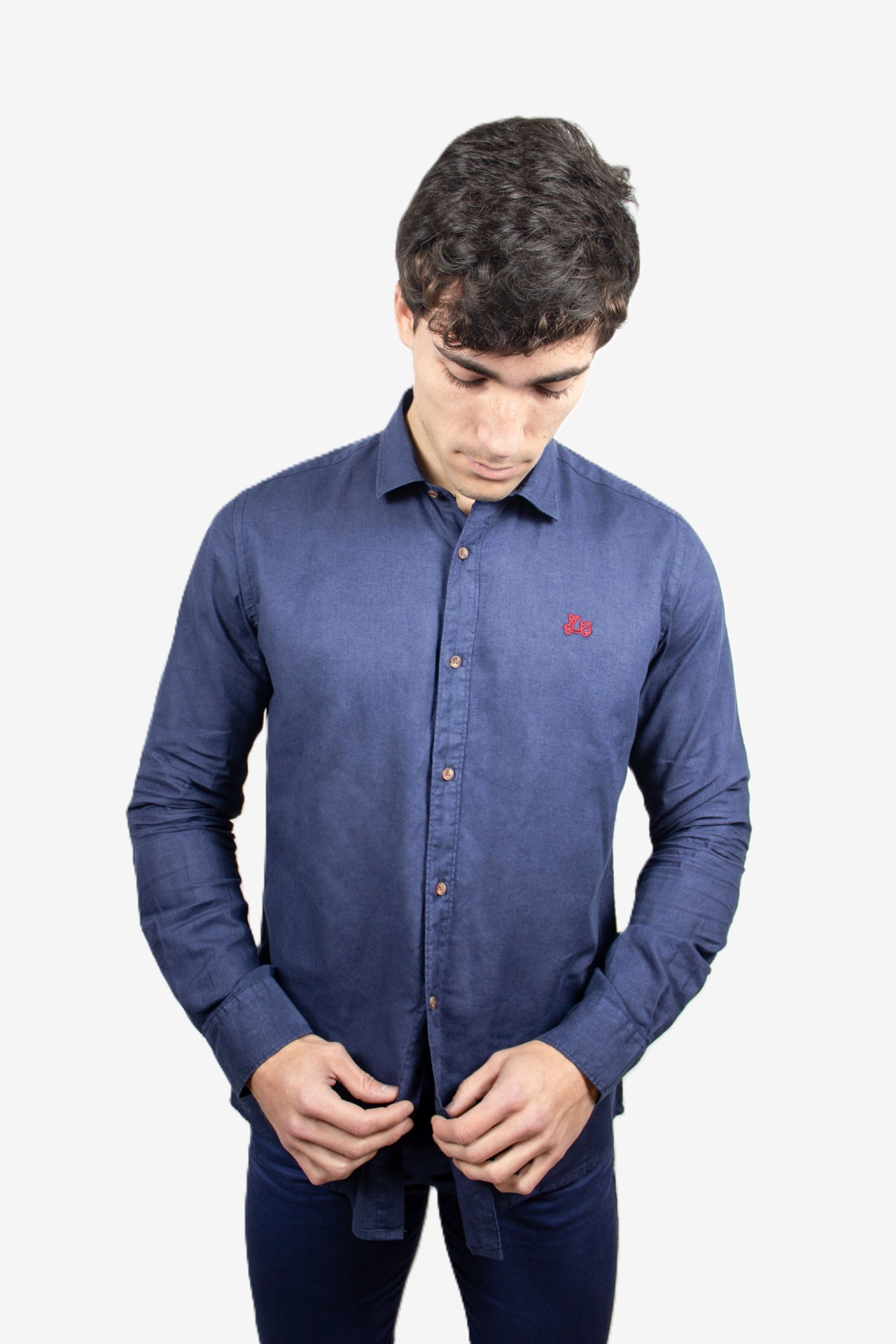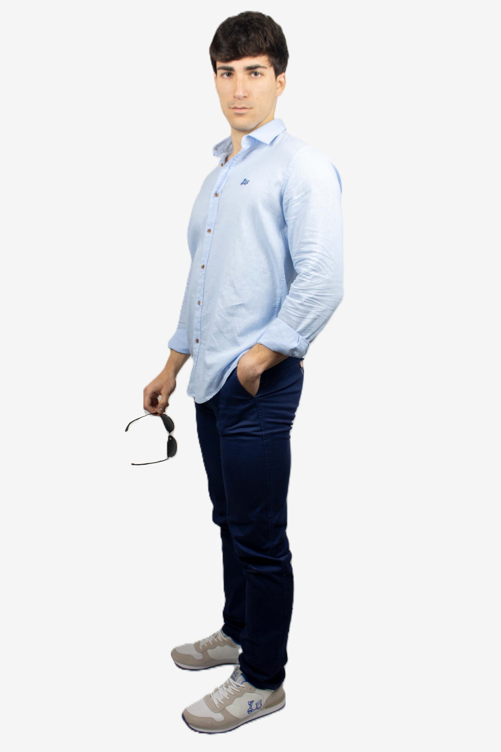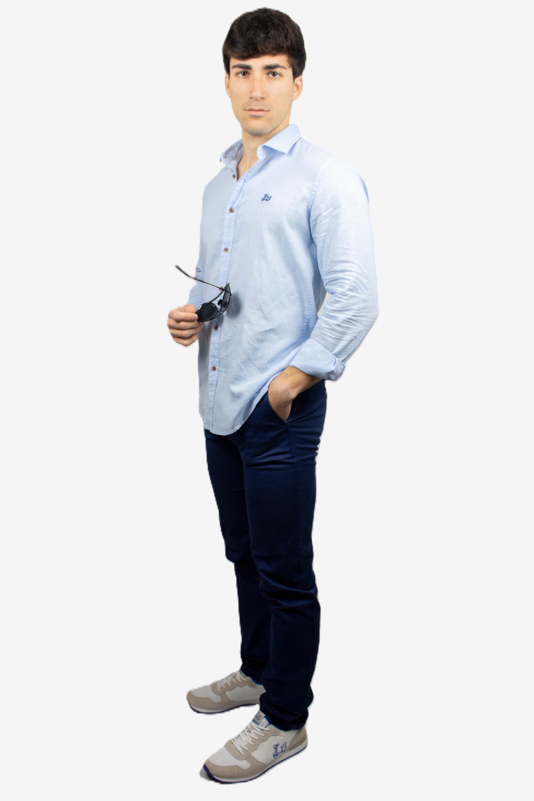 Camisa de lino clásica. Compuesta de mezcla de algodón y lino de corte Regular fit. Presenta diseño de cuello italiano, manga larga con puño abotonado y cierre frontal con botones personalizados. Cuenta con un bordado de moto Ridebike en pecho.