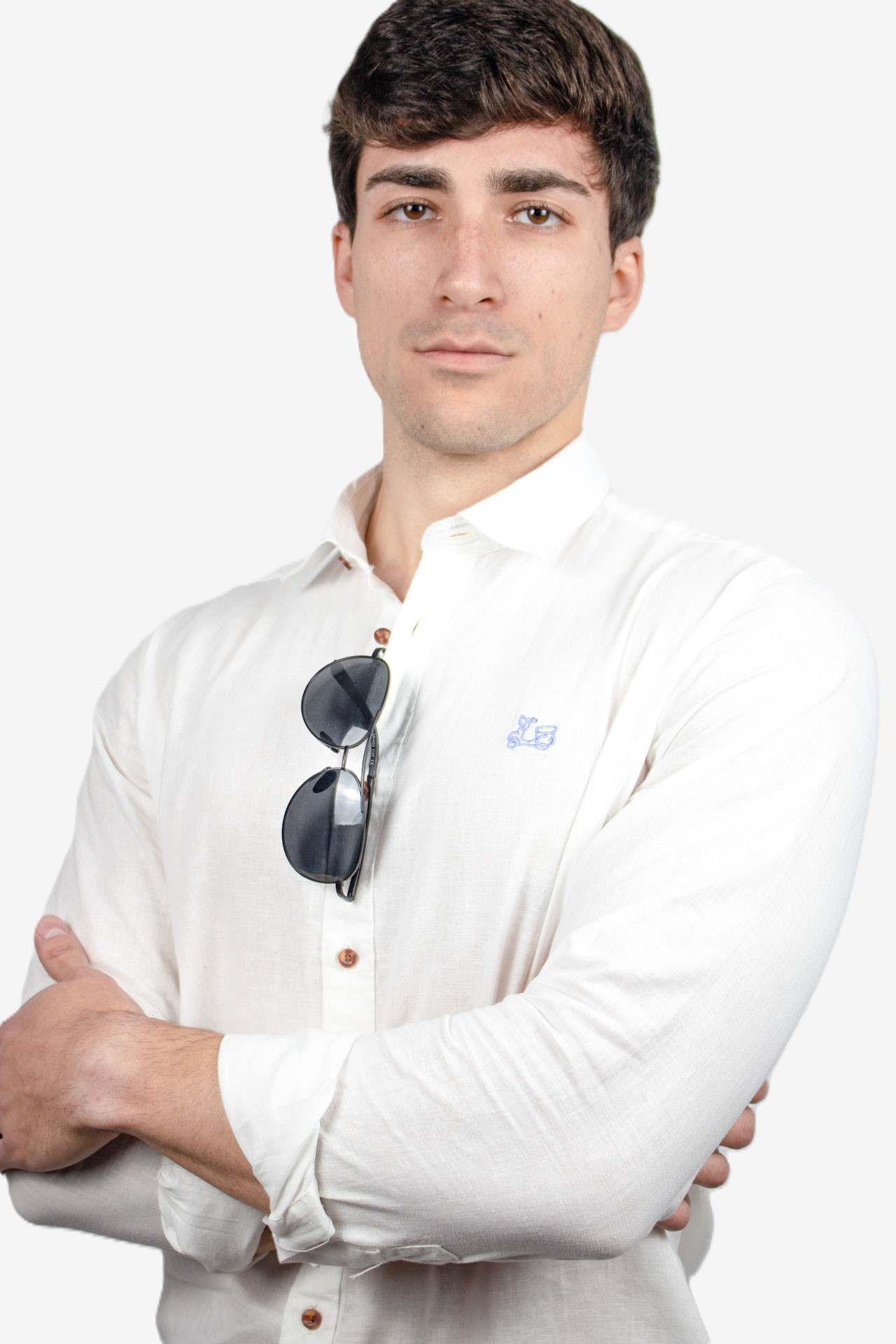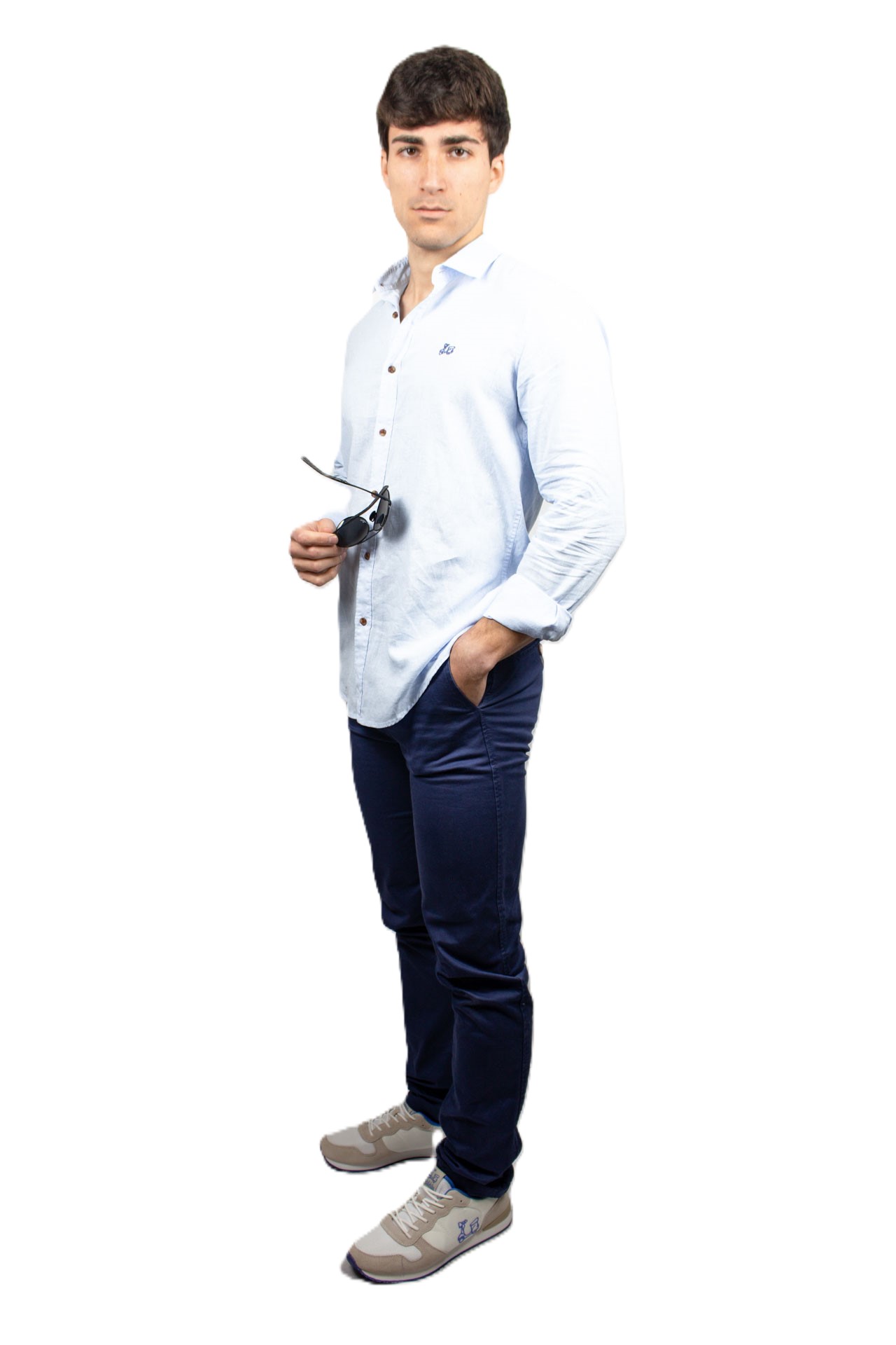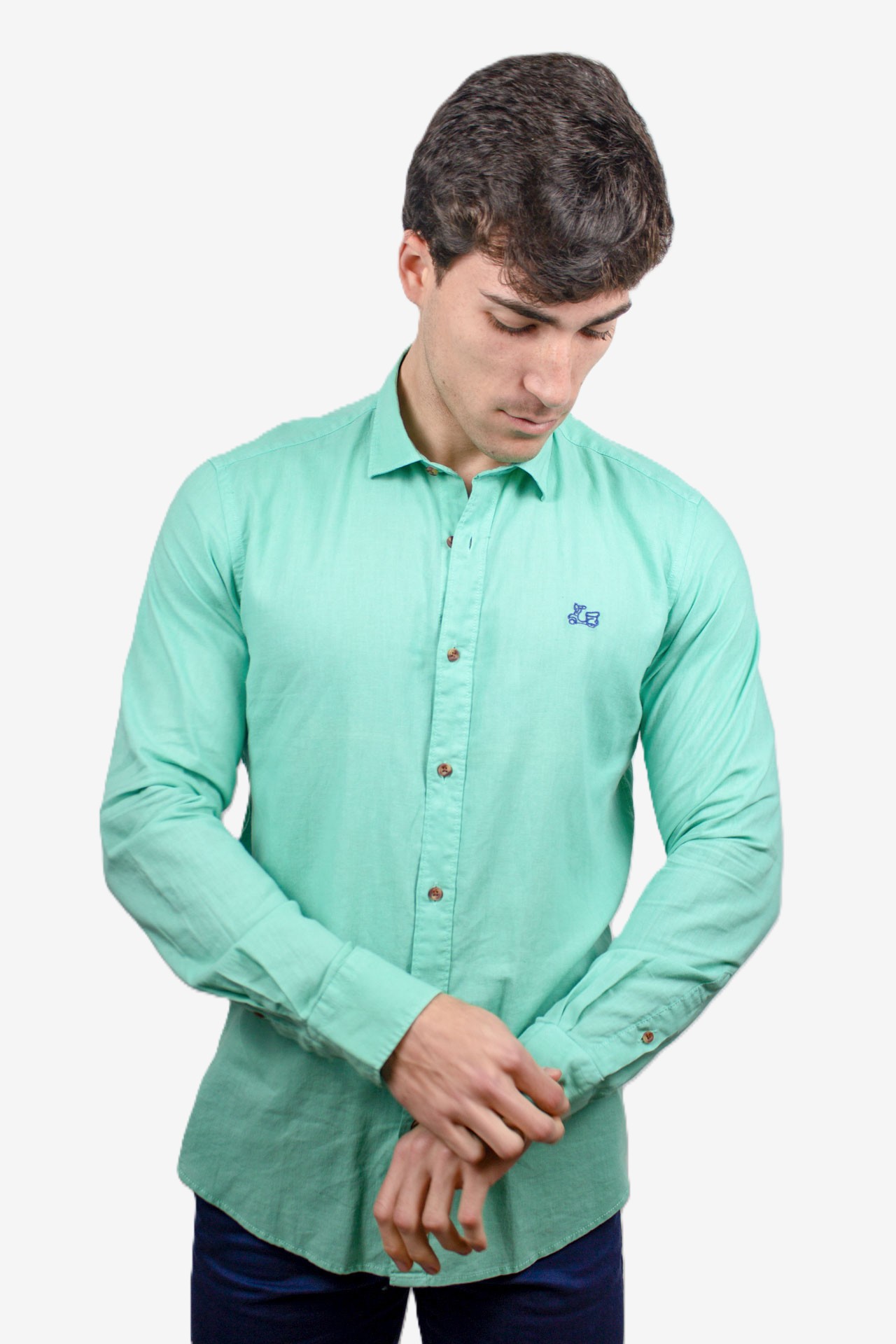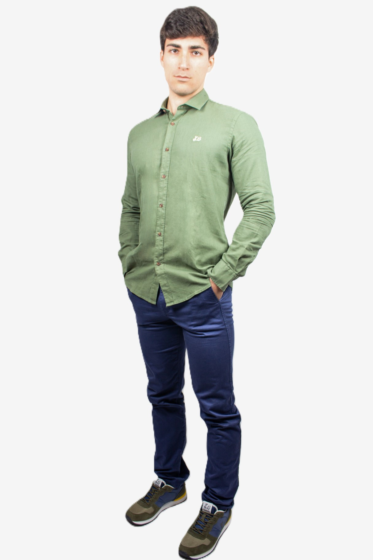 Camisa de lino clásica. Compuesta de mezcla de algodón y lino de corte Regular fit. Presenta diseño de cuello italiano, manga larga con puño abotonado y cierre frontal con botones personalizados. Cuenta con un bordado de moto Ridebike en pecho.