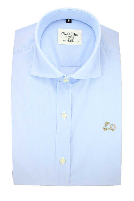 Camisa de milrayas celeste. Manga Larga. Compuesta de 65% algodón y corte semientallado. Cuello italiano. Fabricación nacional.