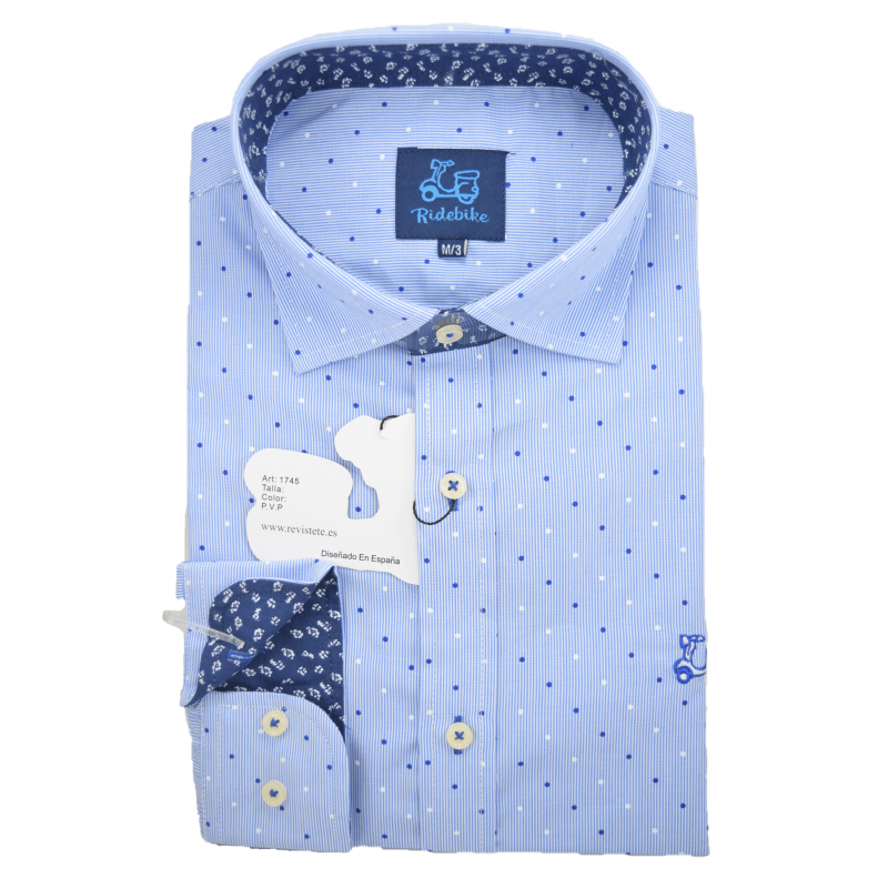 Camisa de milrayas con estampado de topitos color marino y blanco. Fondo azul. Manga Larga. Compuesta de 65% algodón y corte semientallado. Cuello italiano.