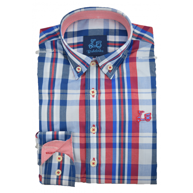 Camisa de niño de cuadros roja y azul. Compuesta de 65% algodón. Manga larga. Cuello con botón.