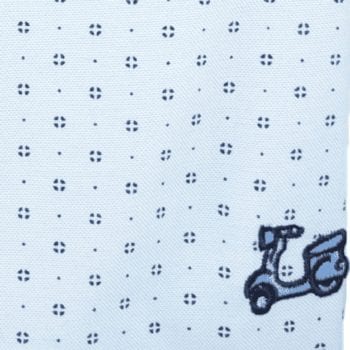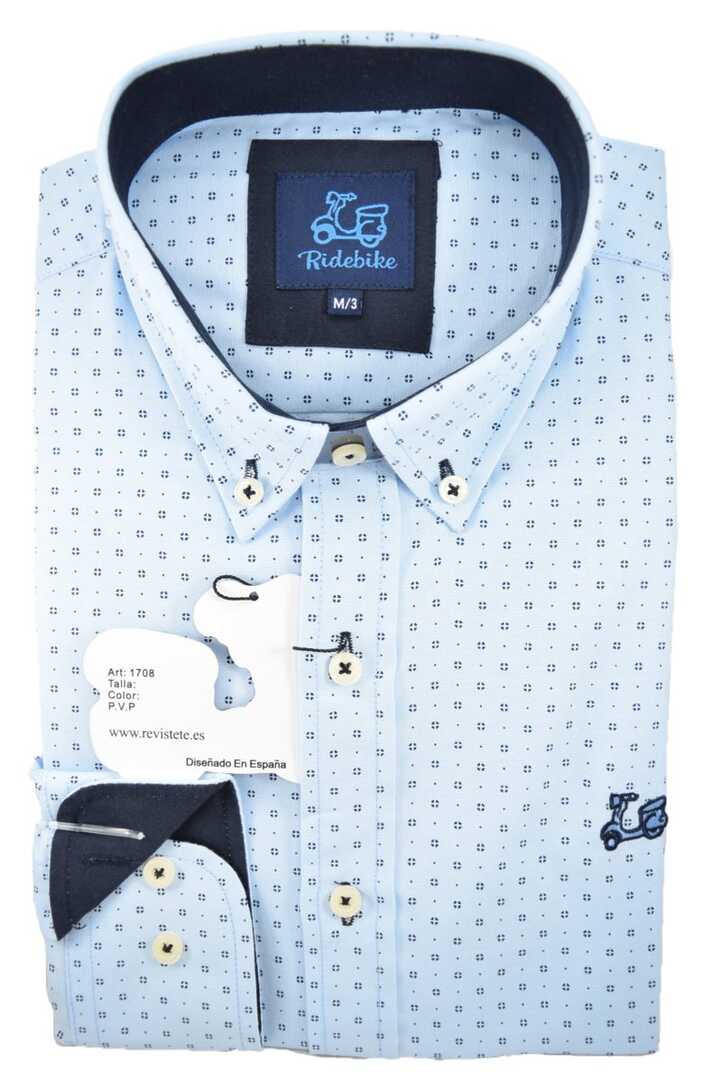 Camisa de niño estampada. Fondo celeste. Manga Larga. Compuesta de 65% algodón. Cuello con botón.