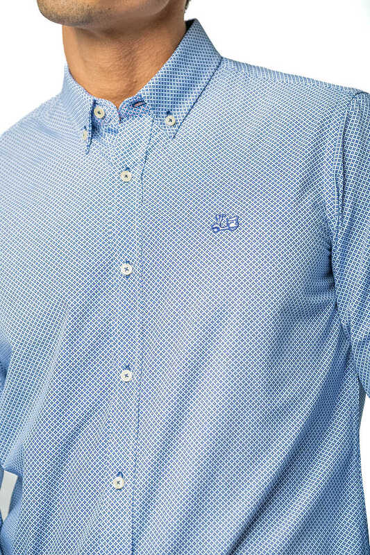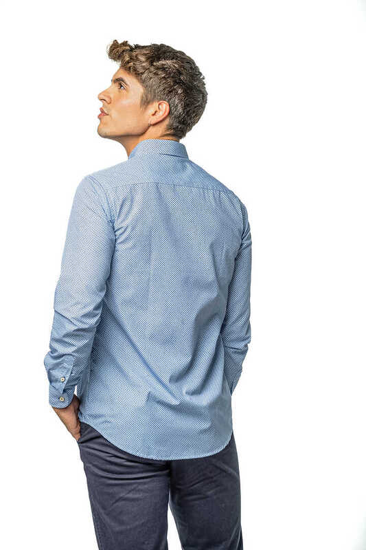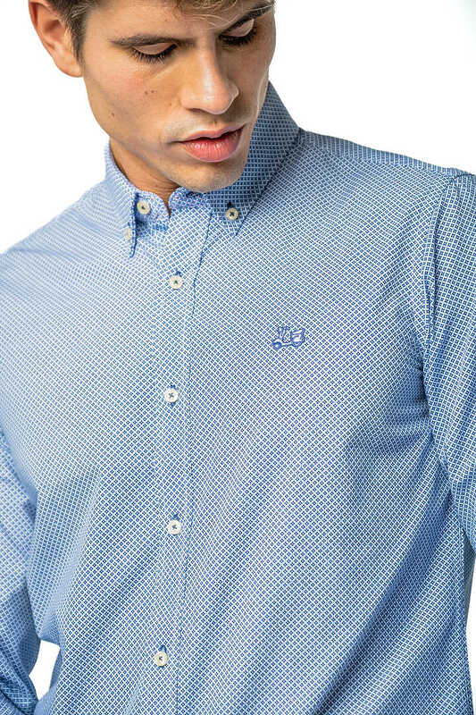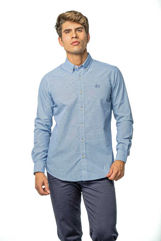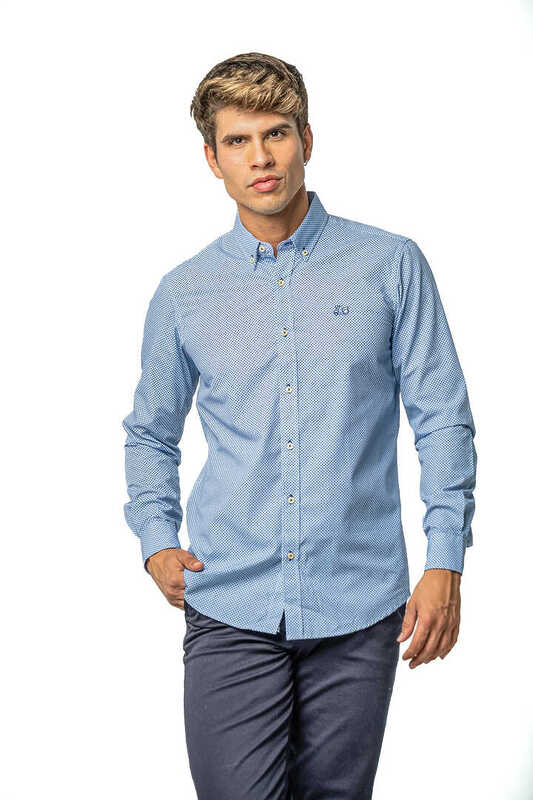 Camisa estampada. Compuesta de 65% algodón. Manga larga. Corte semientallado. Cuello con botón y el puño con cierre de dos botones.