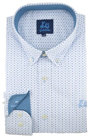 Camisa con estampado geométrico estrellas azules. Compuesta de mezcla de algodón de corte Regular fit. Presenta diseño de cuello button-down, manga larga con puño abotonado y cierre frontal con botones personalizados. Cuenta con un bordado de moto Ridebike en pecho.