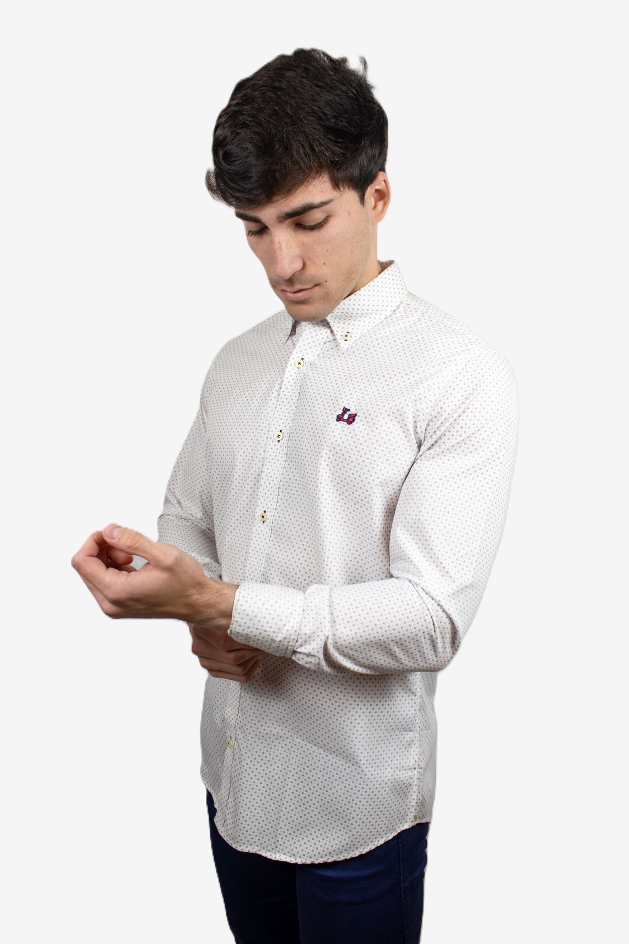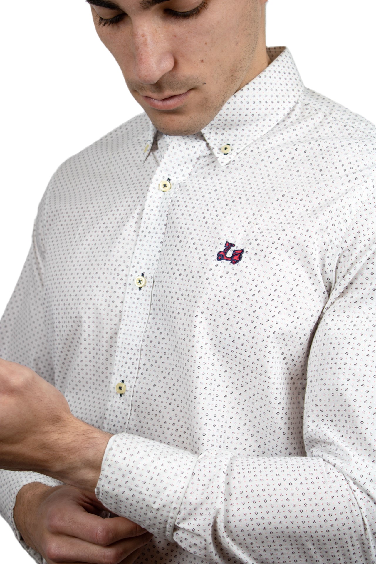 Camisa blanca con estampado floral. Compuesta de mezcla de algodón de corte Regular fit. Presenta diseño de cuello button-down, manga larga con puño abotonado y cierre frontal con botones personalizados. Cuenta con un bordado de moto Ridebike en pecho.