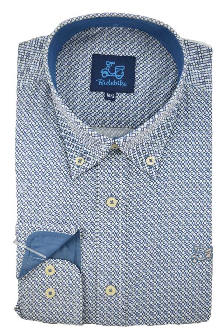 Presenta diseño de cuello button-down, manga larga con puño abotonado y cierre frontal con botones personalizados. Cuenta con un bordado de moto Ridebike en pecho.
