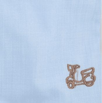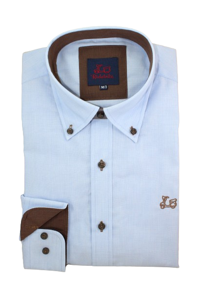 Camisa celeste con codera. Tejido fil a fil. Compuesta de 65% algodón. Manga larga. Corte semientallado. Cuello mao y el puño con cierre de dos botones.
