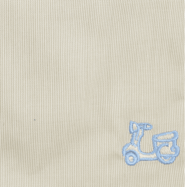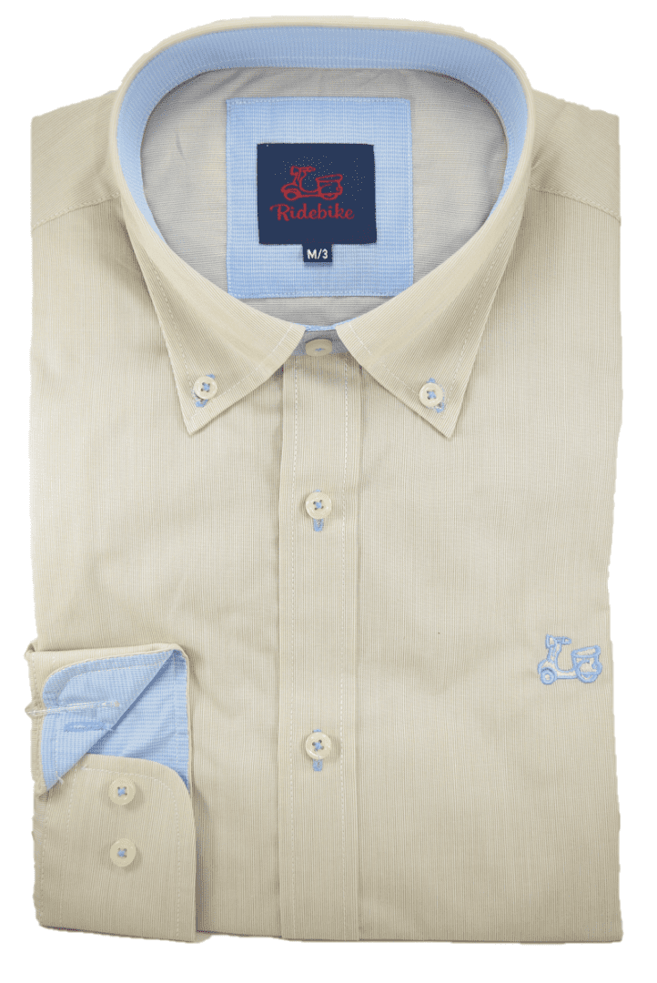 Camisa milrayas beige. Combinación celeste en interior de puño y cuello. Corte semientallado. Manga larga. Logotipo de vespita bordado en pecho. Cuello con botón y el puño con cierre de dos botones.