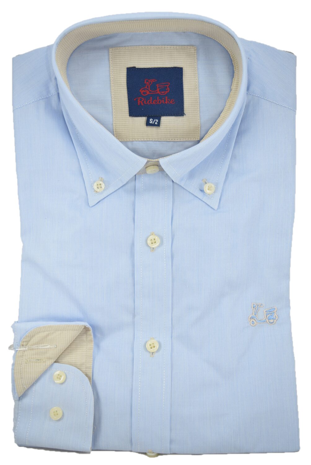 Camisa milrayas celeste. Combinación beige en interior de puño y cuello. Corte semientallado. Manga larga. Logotipo de vespita bordado en pecho. Cuello con botón y el puño con cierre de dos botones.