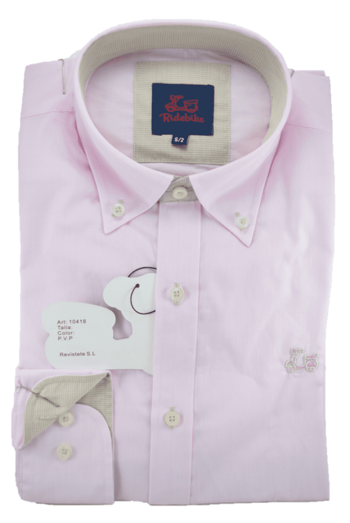 Camisa milrayas rosa. Combinación beige en interior de puño y cuello. Corte semientallado. Manga larga. Logotipo de vespita bordado en pecho. Cuello con botón y el puño con cierre de dos botones.