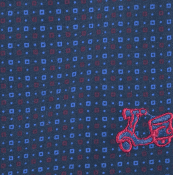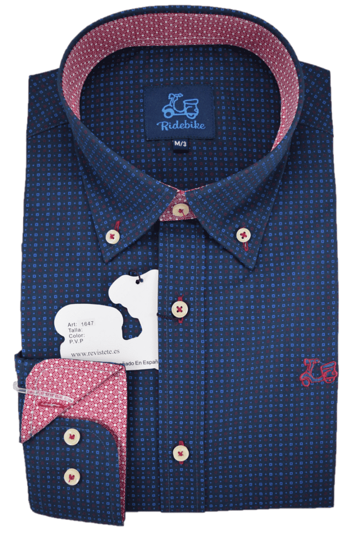 Camisa para niños, color azul oscuro con estampados. Manga larga. Logotipo de vespita Ridebike bordado en pecho. Cuello con botón y el puño con cierre de dos botones.