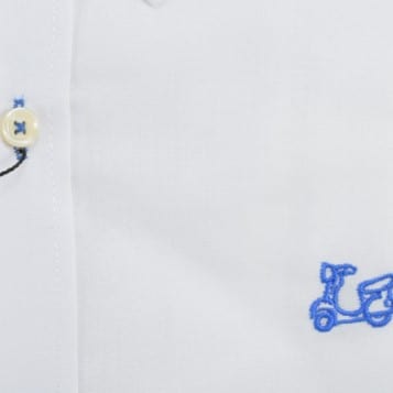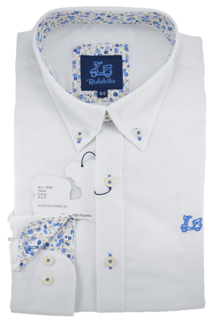 Camisa blanca de niño con combinado de flores en puño y cuello. Compuesta de 65% algodón. Manga larga. Cuello con botones.