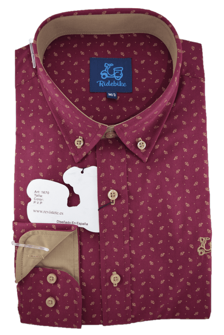 Camisa color burdeos rojo con estampados camel para niños. Manga larga. Logotipo de vespita Ridebike bordado en pecho. Cuello con botón y el puño con cierre de dos botones.