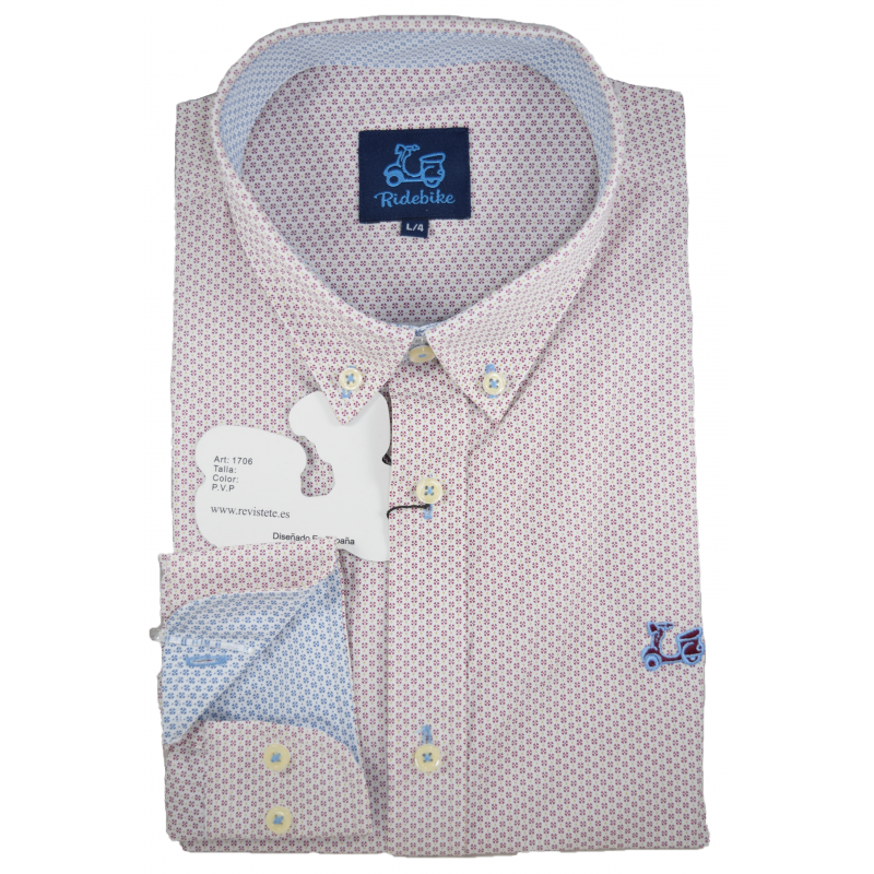 Camisa de niño de estampado burdeos y micropuntos. Fondo blanco. Compuesta de 65% algodón. Manga larga. Cuello con botón y el puño con cierre de dos botones.