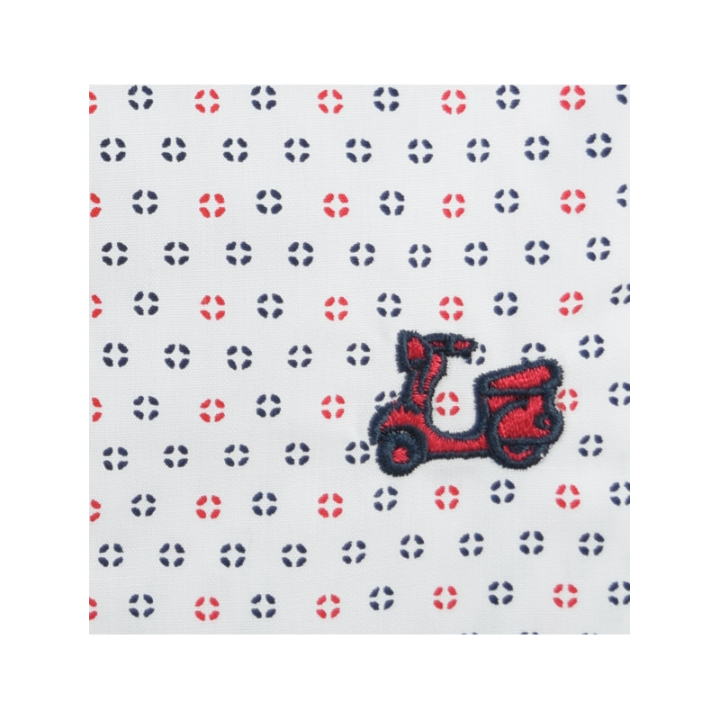 Camisa de niño con estampado geométrico color rojo y marino. Compuesta de 65% algodón. Manga larga. Cuello mao.