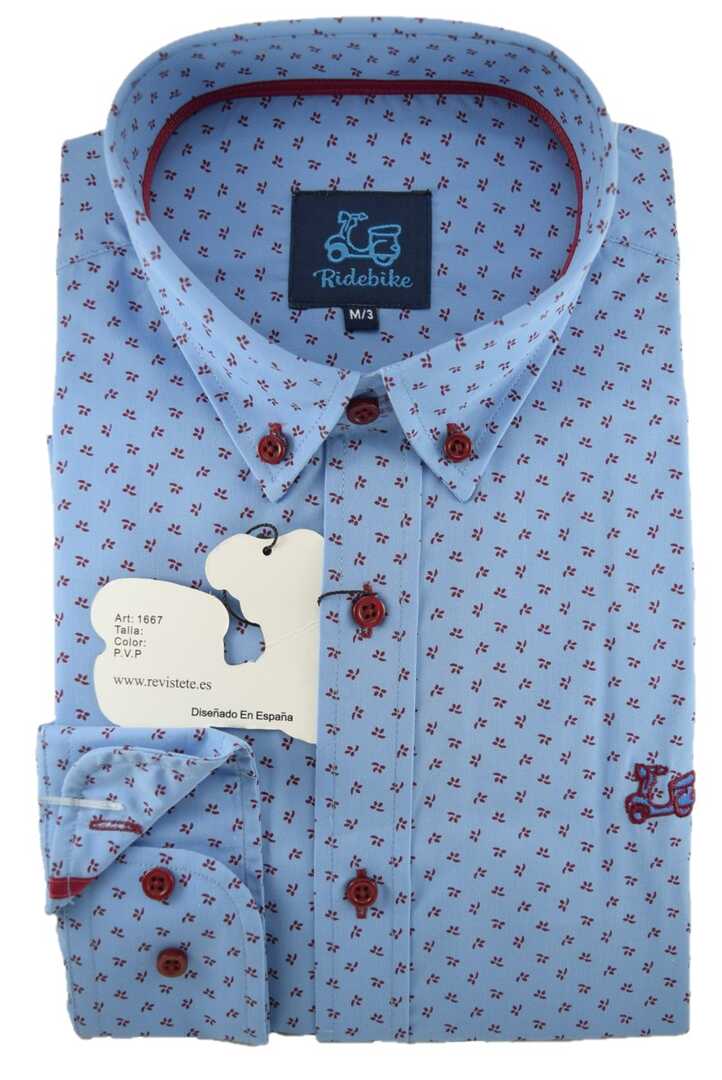 Camisa de niño con estampado floral tono rojo. Fondo azul celeste. Compuesta de 65% algodón. Manga larga. Cuello con botón.