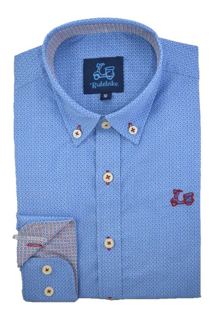 Camisa de niño con estampado geométrico. Compuesta de 65% algodón. Manga larga. Cuello con botón.