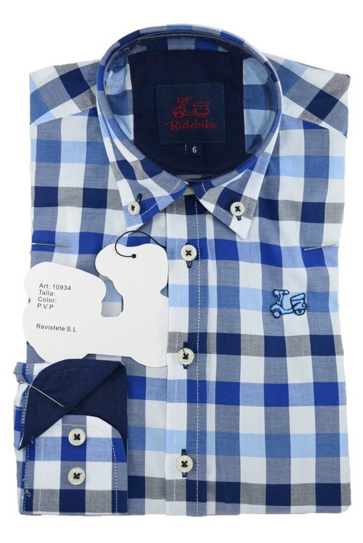 Camisa para niños de cuadros azules. Compuesta de 65% algodón. Manga larga. Cuello con botón y el puño con cierre de dos botones.