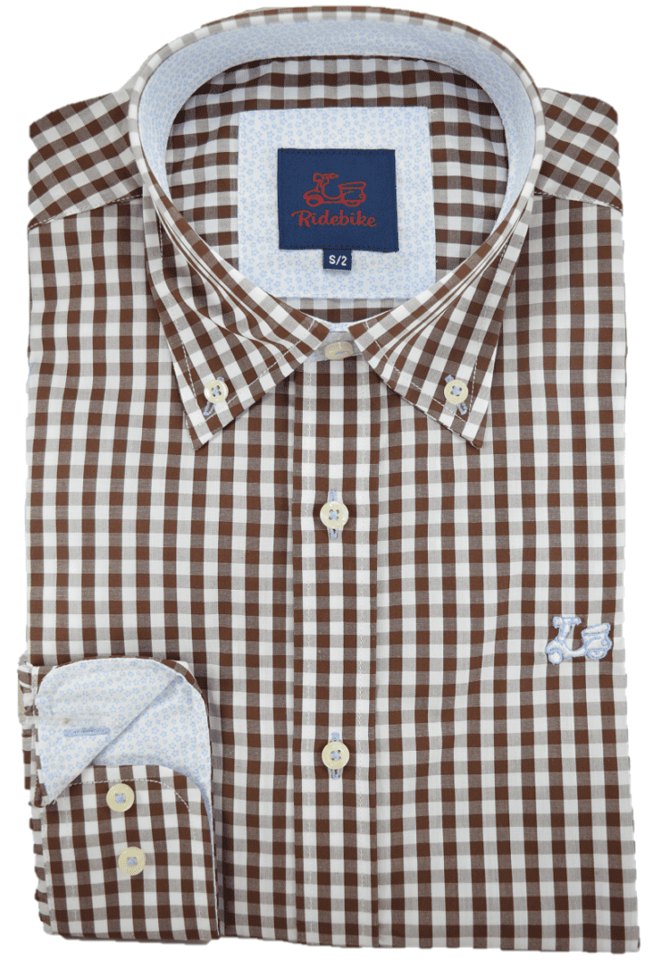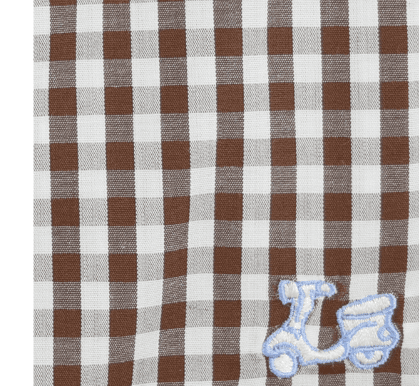 Camisa de cuadros marrones para niños. Combinación floral en interior de puño y cuello. Manga larga. Logotipo de vespita bordado en pecho. Cuello con botón y el puño con cierre de dos botones.