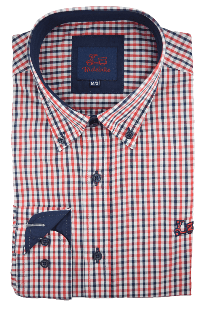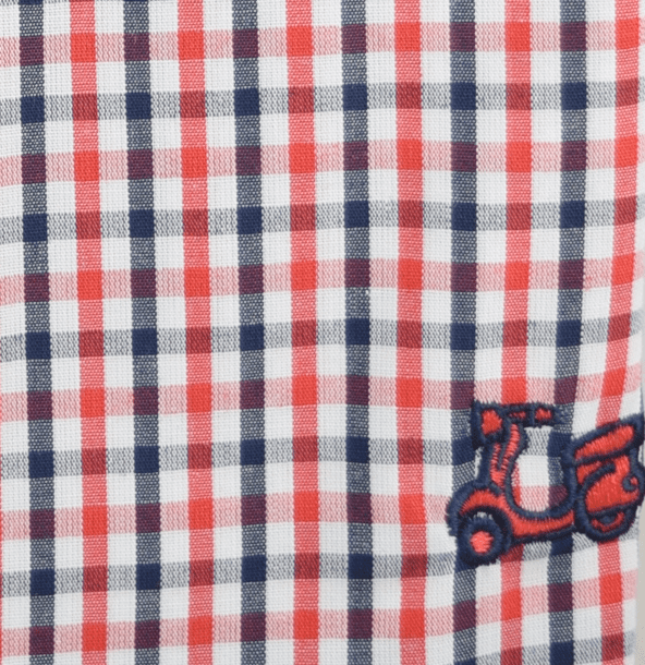 Camisa de cuadros rojos. Combinación azul marino en interior de puño y cuello. Manga larga. Logotipo de vespita bordado en pecho. Cuello con botón y el puño con cierre de dos botones.