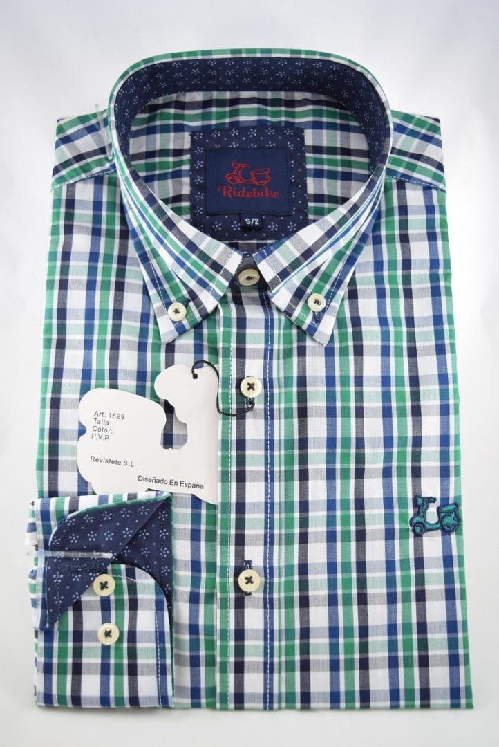 Camisa de cuadros verdes para niños. Combinación estampado floral en interior de puño y cuello. Manga larga. Logotipo de vespita bordado en pecho. Cuello con botón y el puño con cierre de dos botones.