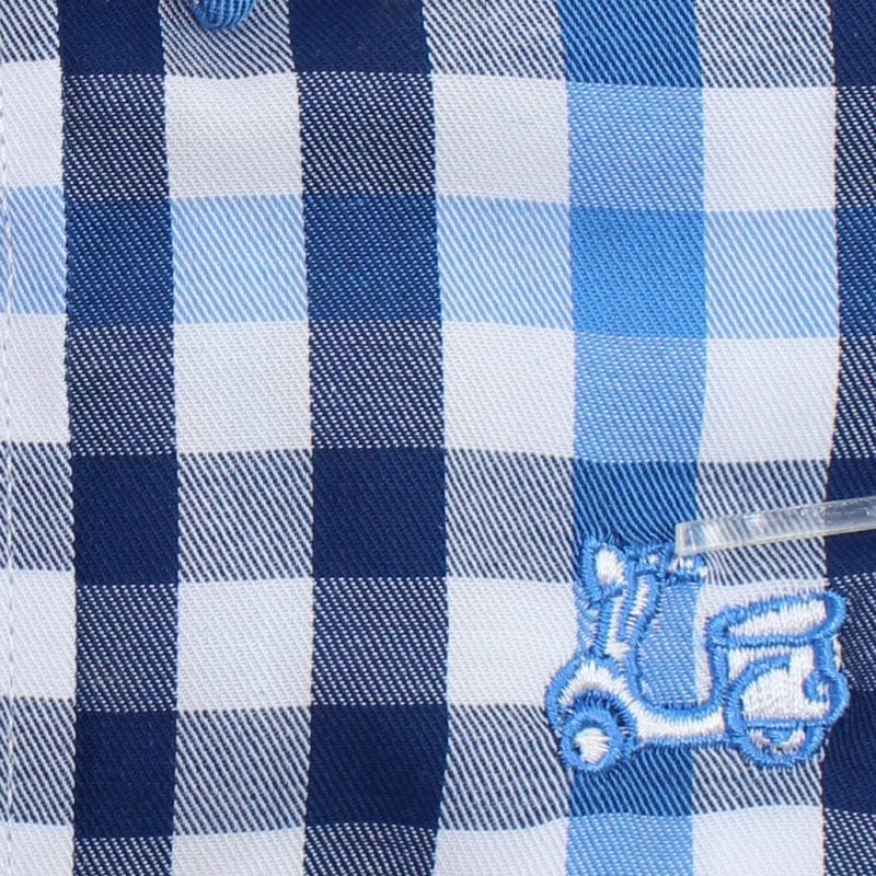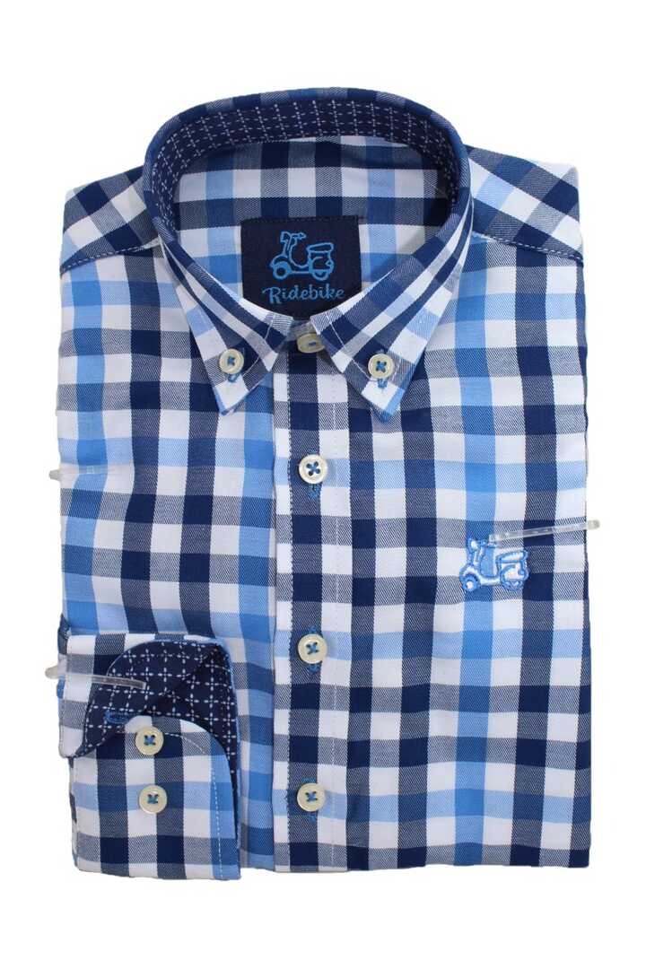 Camisa de niño de cuadros celeste y marino. Tejido sarga. Manga larga. Compuesta de 65% algodón. Cuello con botones.