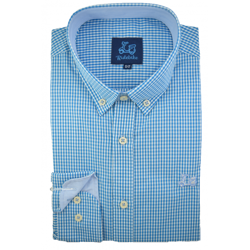 Camisa niño de cuadros Vichy celeste. Compuesta de 65% algodón. Manga larga. Cuello con botones.