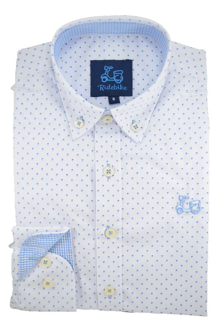 Camisa niño con estampado de líneas azules. Compuesta de 65% algodón. Manga larga. Cuello con botones.