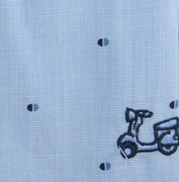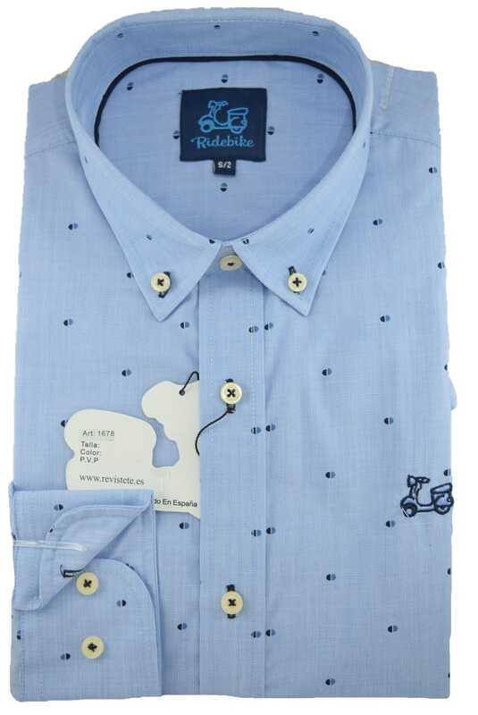 Camisa niño con estampado de topitos azul y marino. Compuesta de 65% algodón. Manga larga. Cuello con botón.