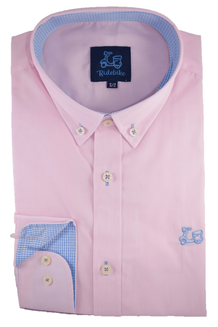 Camisa de mil rayas color rosa de niño. Compuesta de 65% algodón. Manga larga. Cuello con botón y el puño con cierre de dos botones.